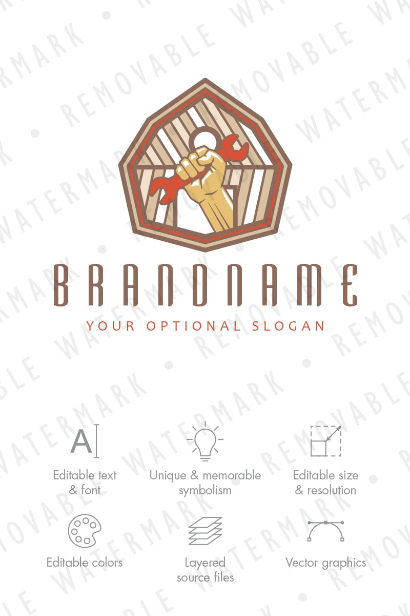 Logo template with idea of stylized barn and human hand holding spanner or wrench. Theme can be interesting for repair and tool shops, parts or equipment distributors, home repair, handymen and maintenance services, workshops, construction companies and similar.