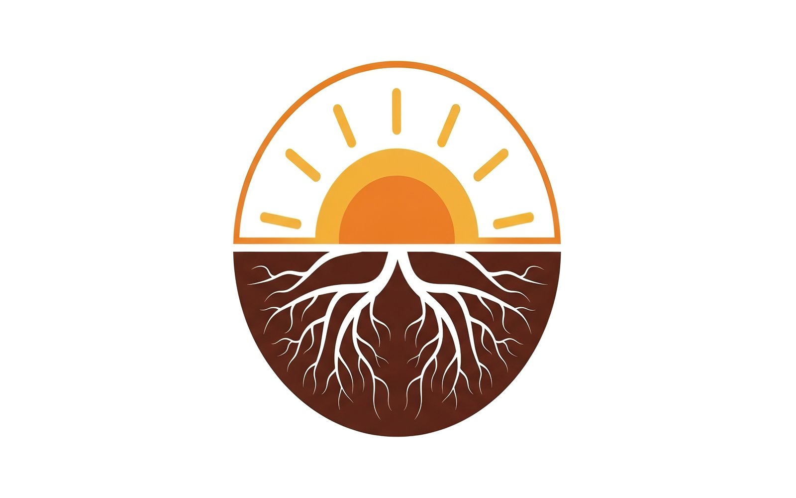 Sun rising over earth with plant root system growing below isolated on white background Logo Template