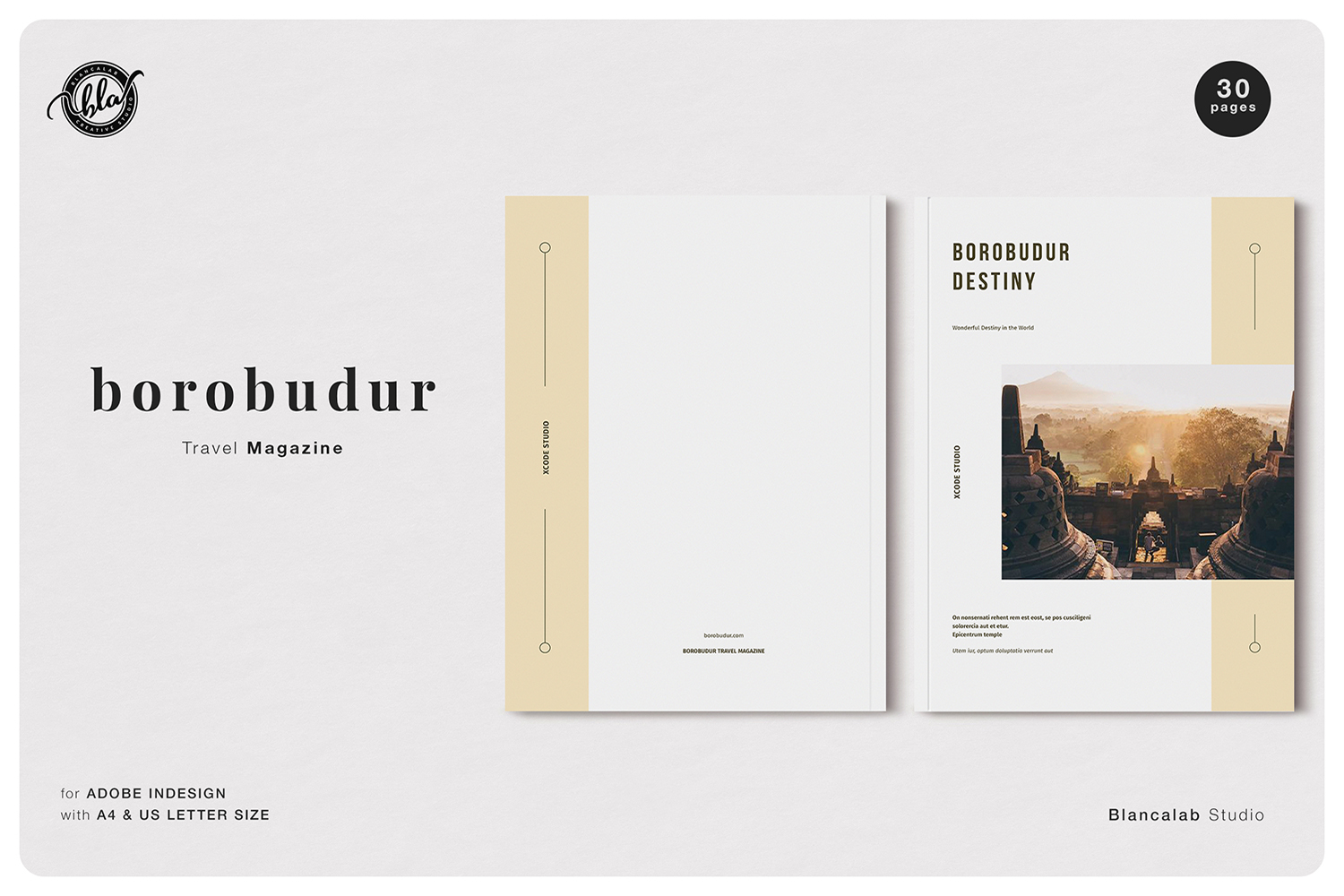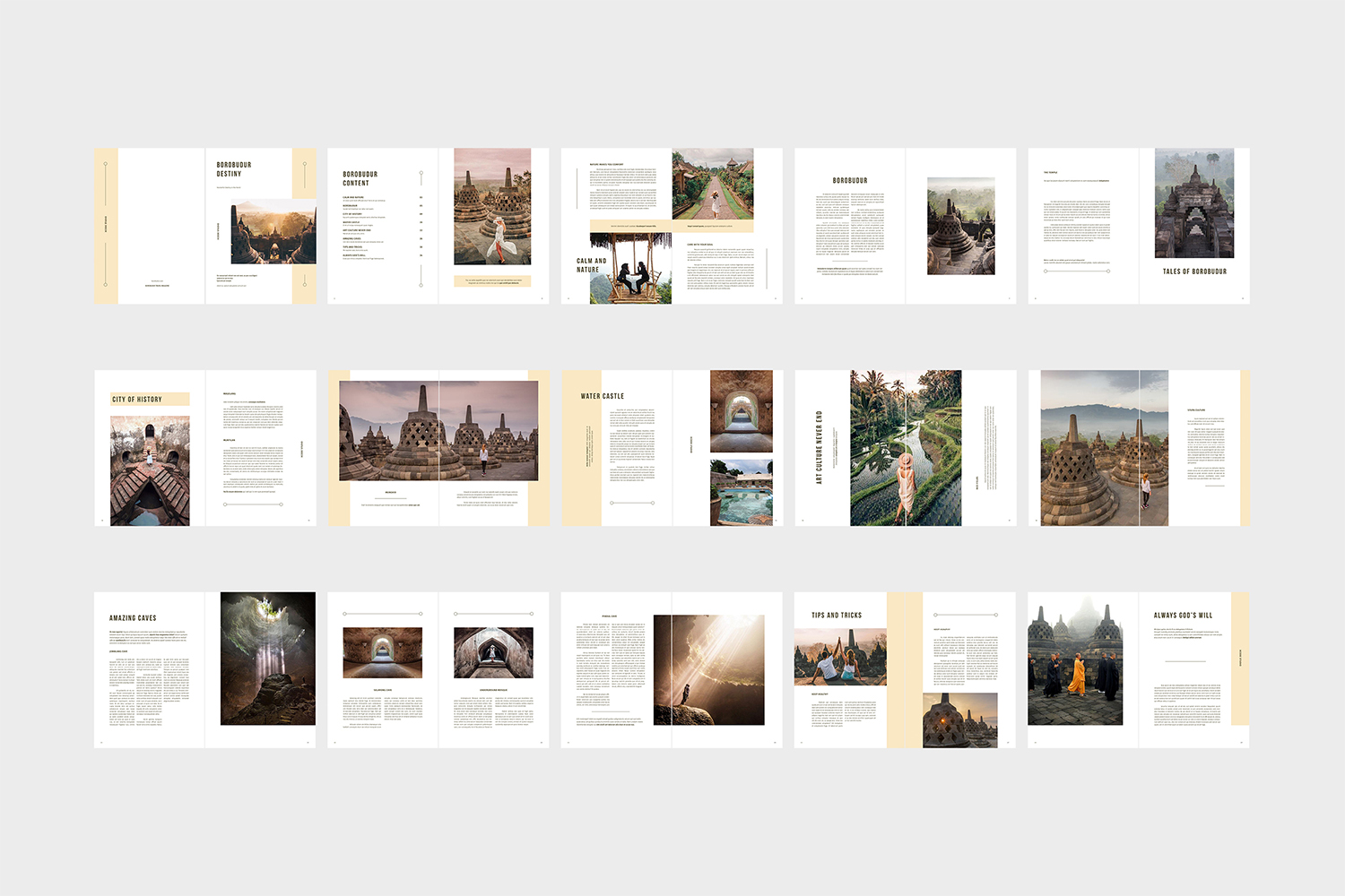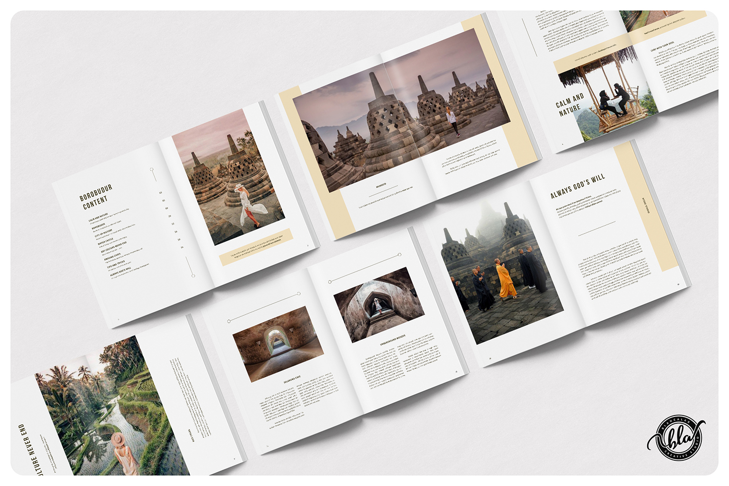 Borobudur is a travel magazine layout with layered imagery, bold graphic elements and flashes of color. The layouts are minimal, beautifully spaced and elegant.