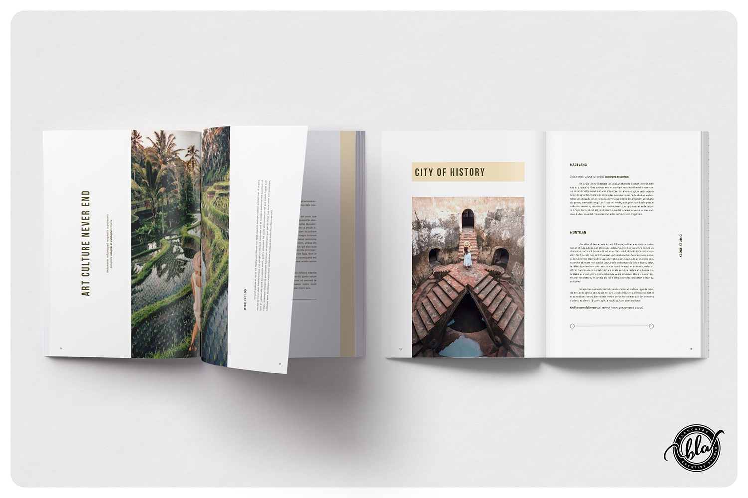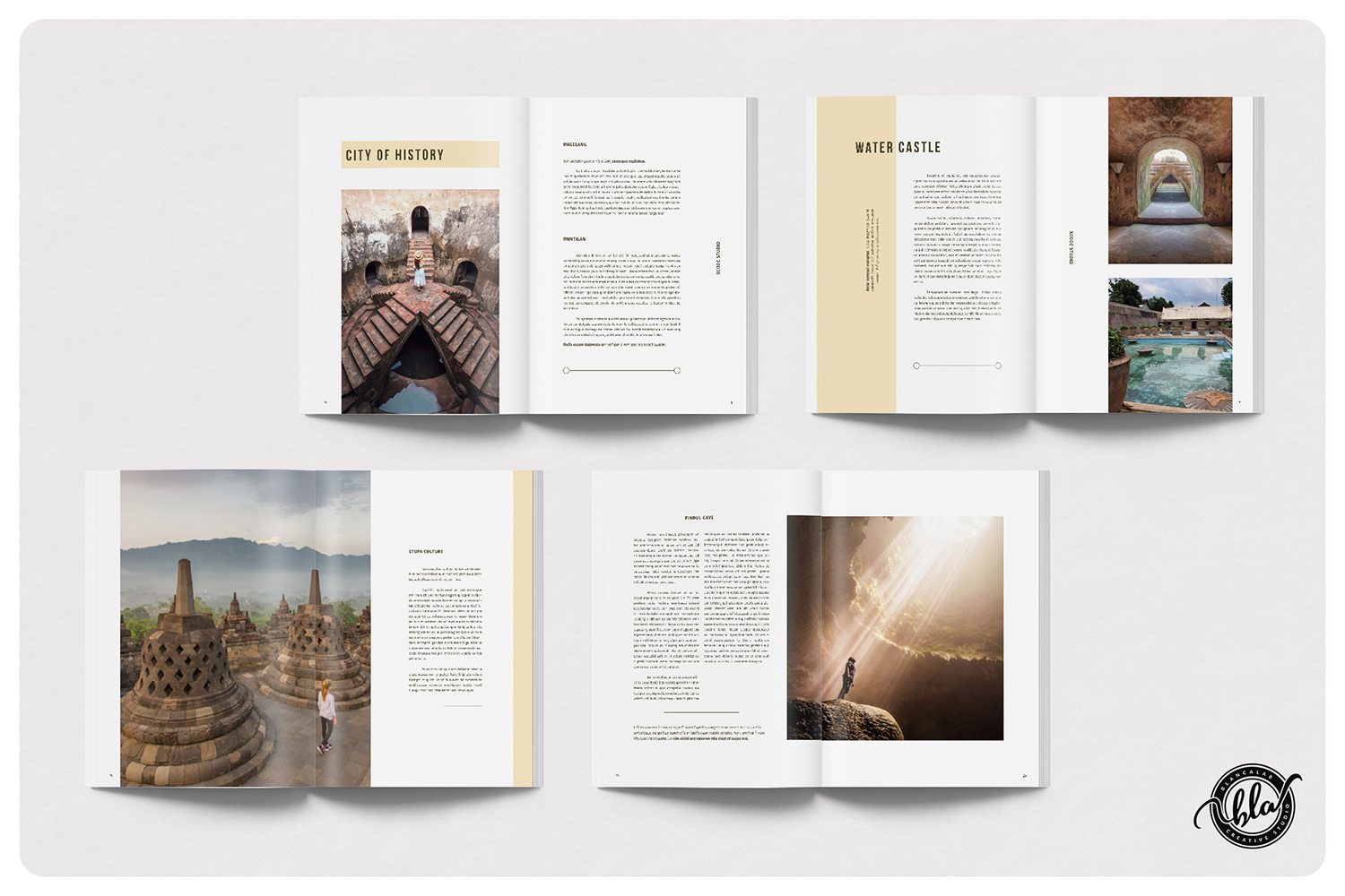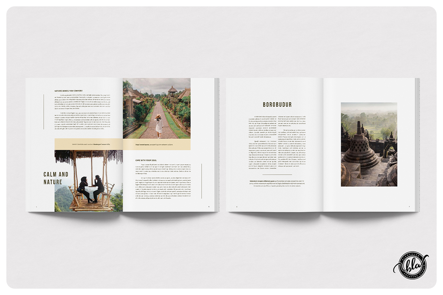 Borobudur is a travel magazine layout with layered imagery, bold graphic elements and flashes of color. The layouts are minimal, beautifully spaced and elegant.
