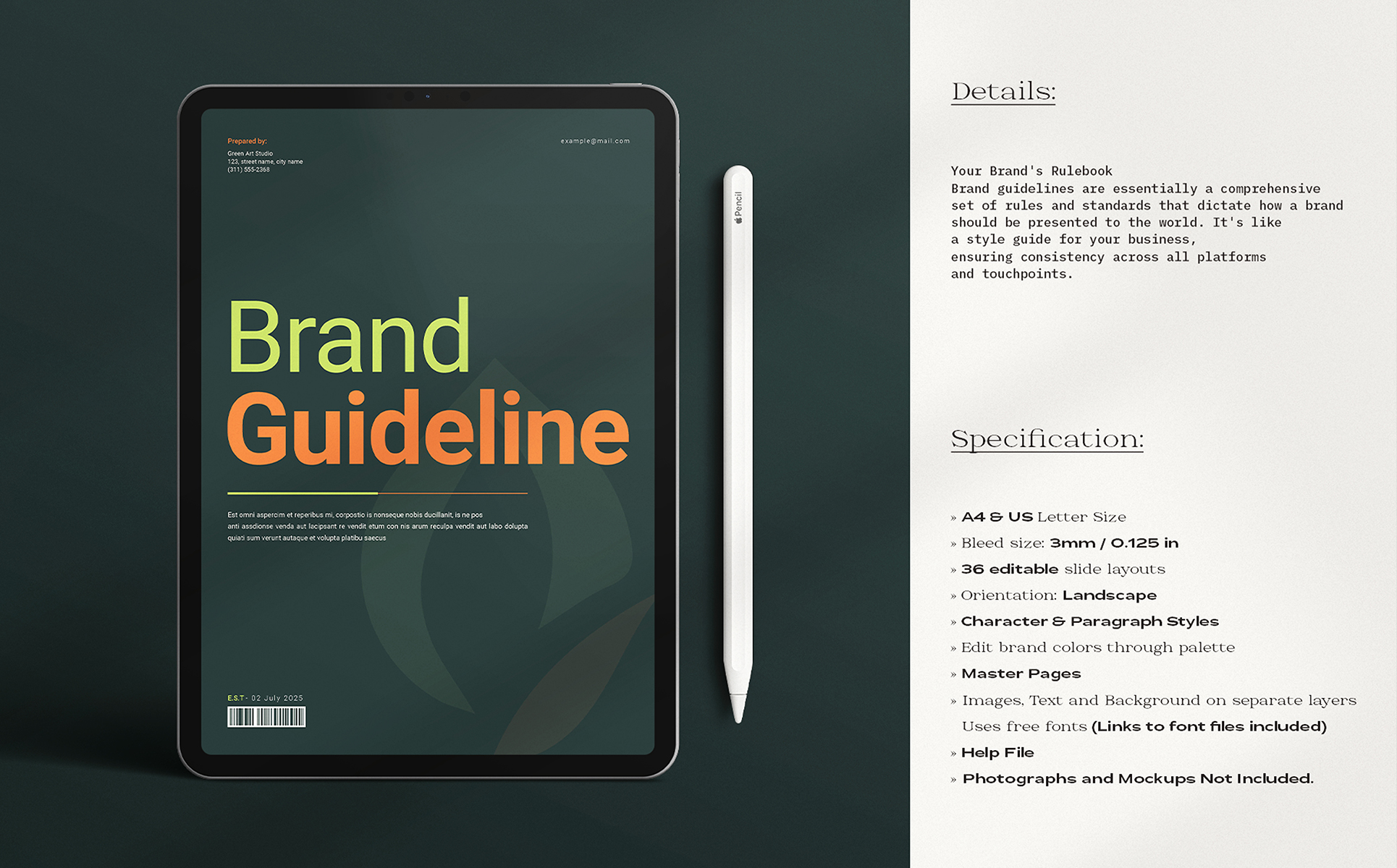 36 pages Brand Identity Guidelines Template is fully editable template created for Adobe InDesign.