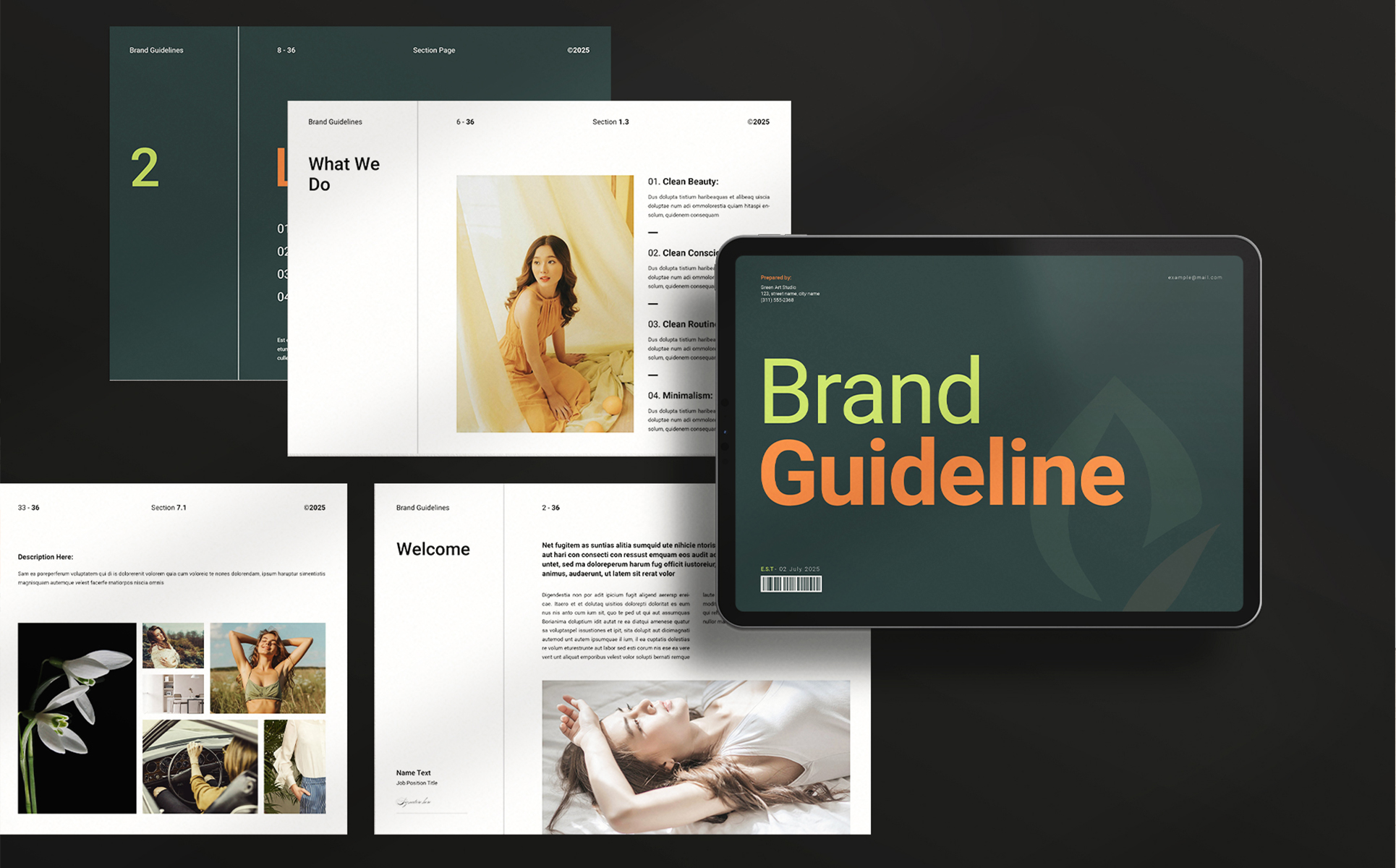 We have designed this template to be as flexible as possible for a variety of clients. This template features 7 sections and is packed full of features. Sections include: The Brand, Logo, Color Palette, Typography, Imagery, Application & Contact.