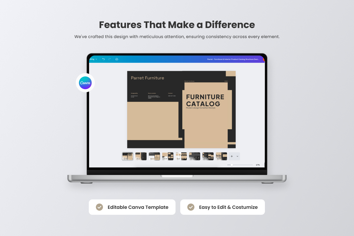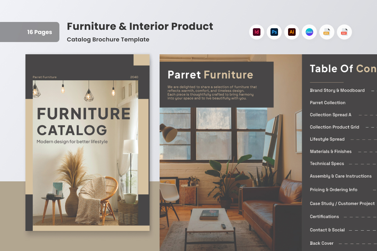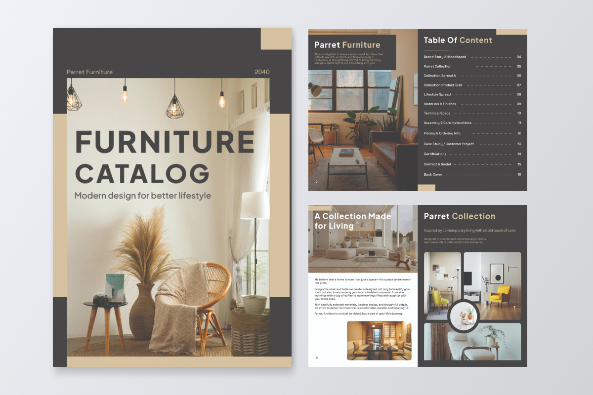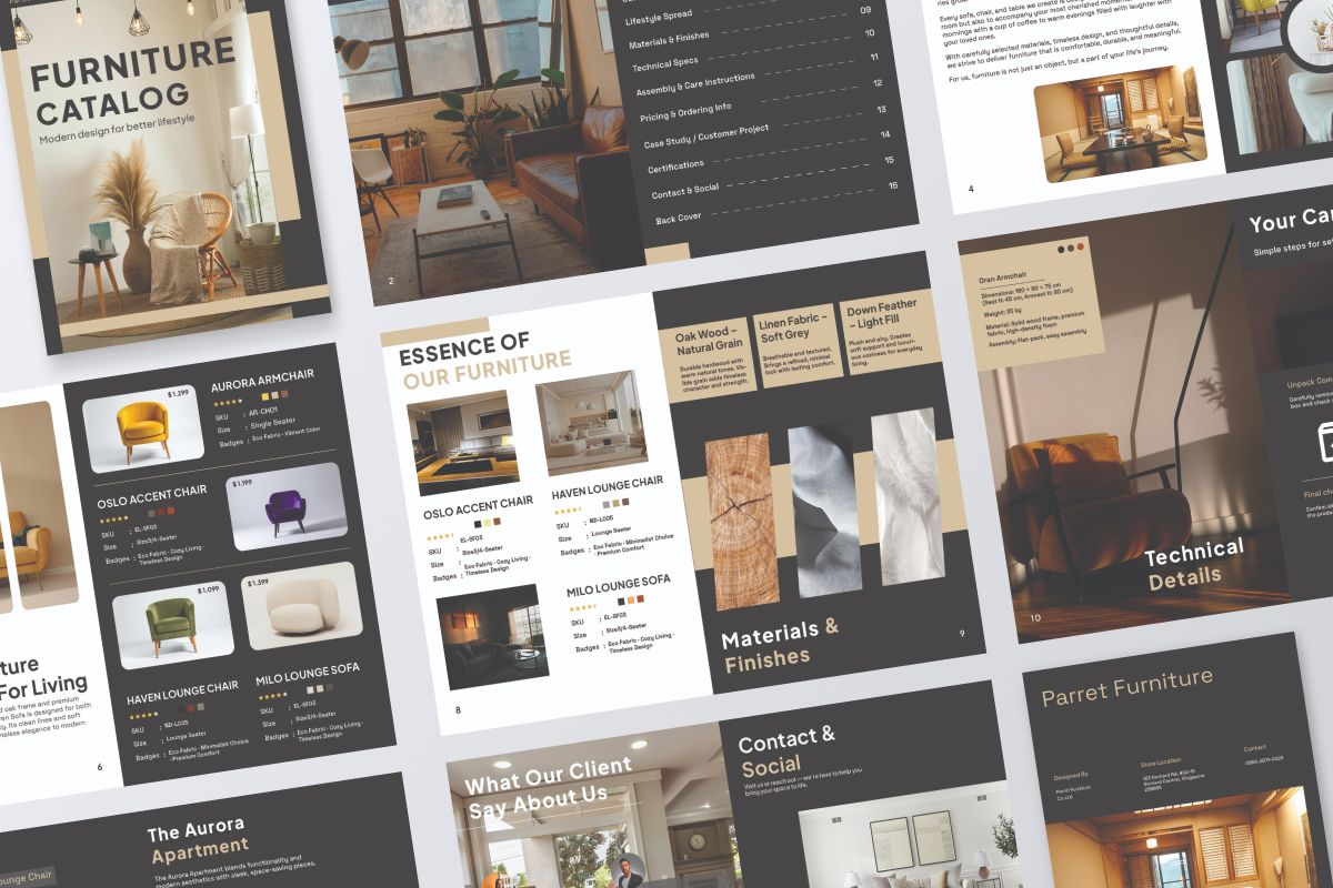Perfect for architects, interior design studios, and lifestyle brands that want to create a compelling printed or digital product catalog that aligns with a high-end aesthetic.