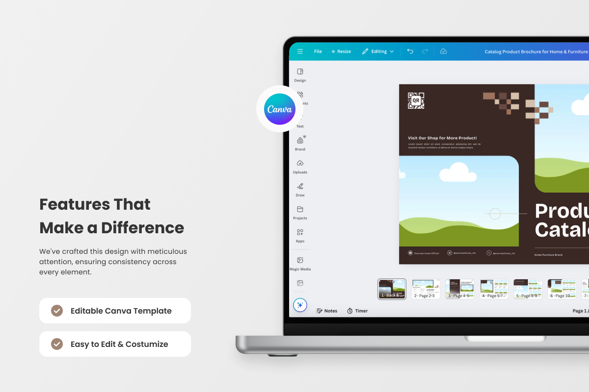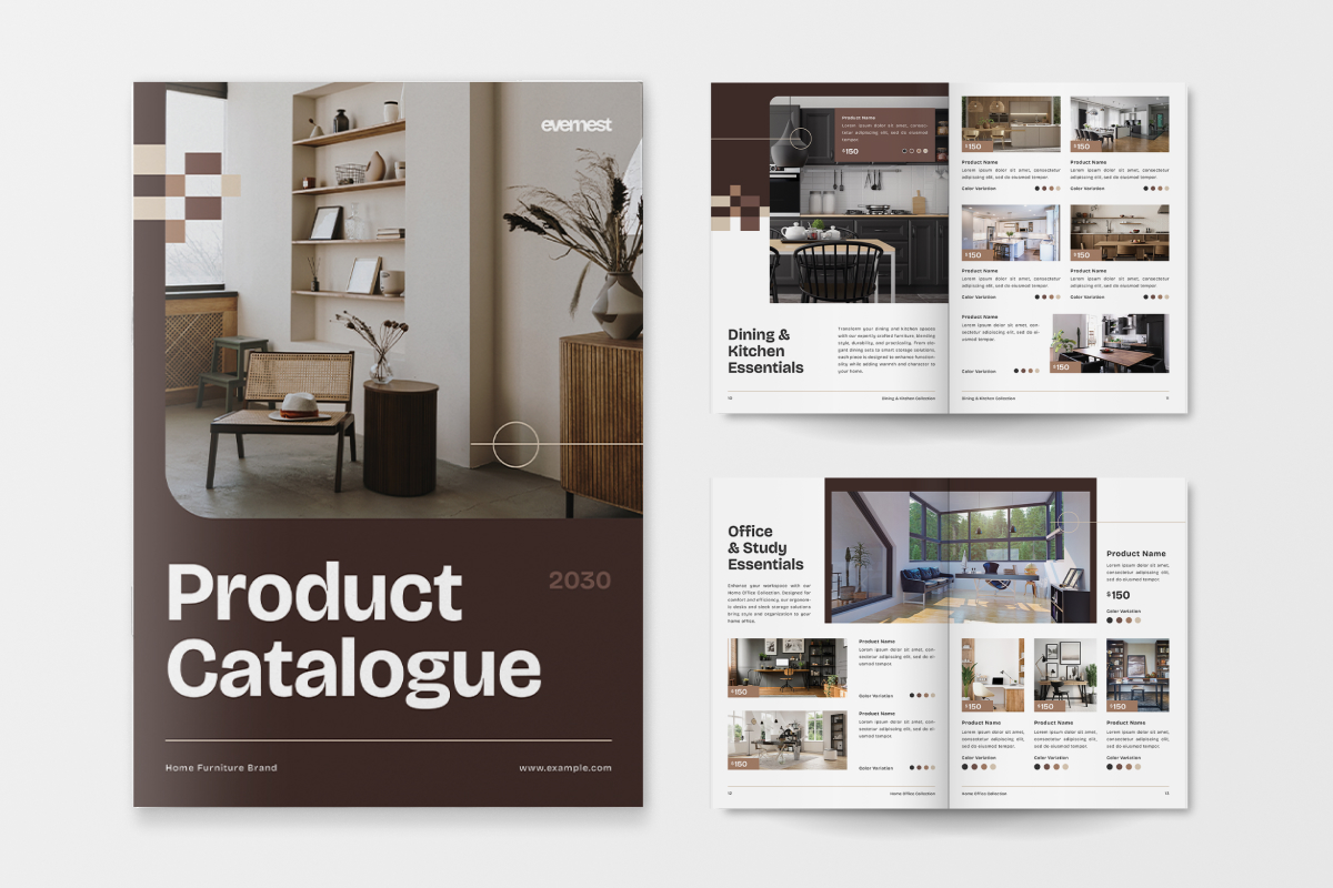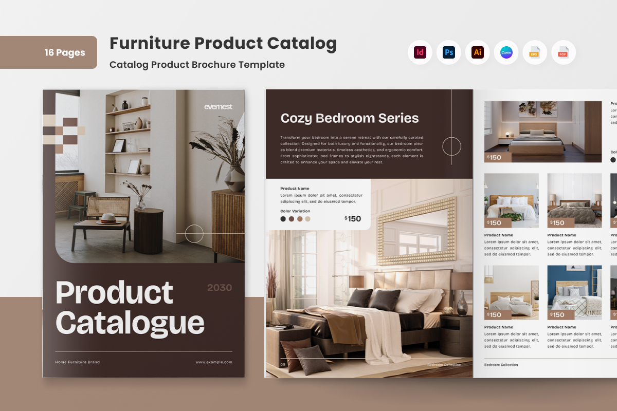 Present your home and furniture products with elegance using this professionally designed catalog brochure. Featuring a clean grid-based layout, warm beige and soft brown tones, and modern sans-serif typography, this brochure enhances your brand’s visual appeal. Perfect for interior designers, furniture retailers, and product marketers, it incorporates lifestyle photography and product feature icons to create a seamless browsing experience.