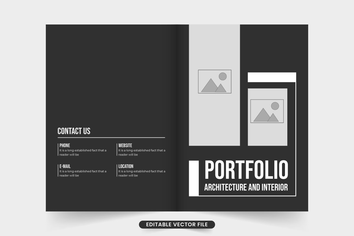 Modern real estate magazine cover vector. Architecture and interior portfolio cover template for marketing. Modern real estate business promotional magazine design with photo placeholders. Architect business advertisement cover template.