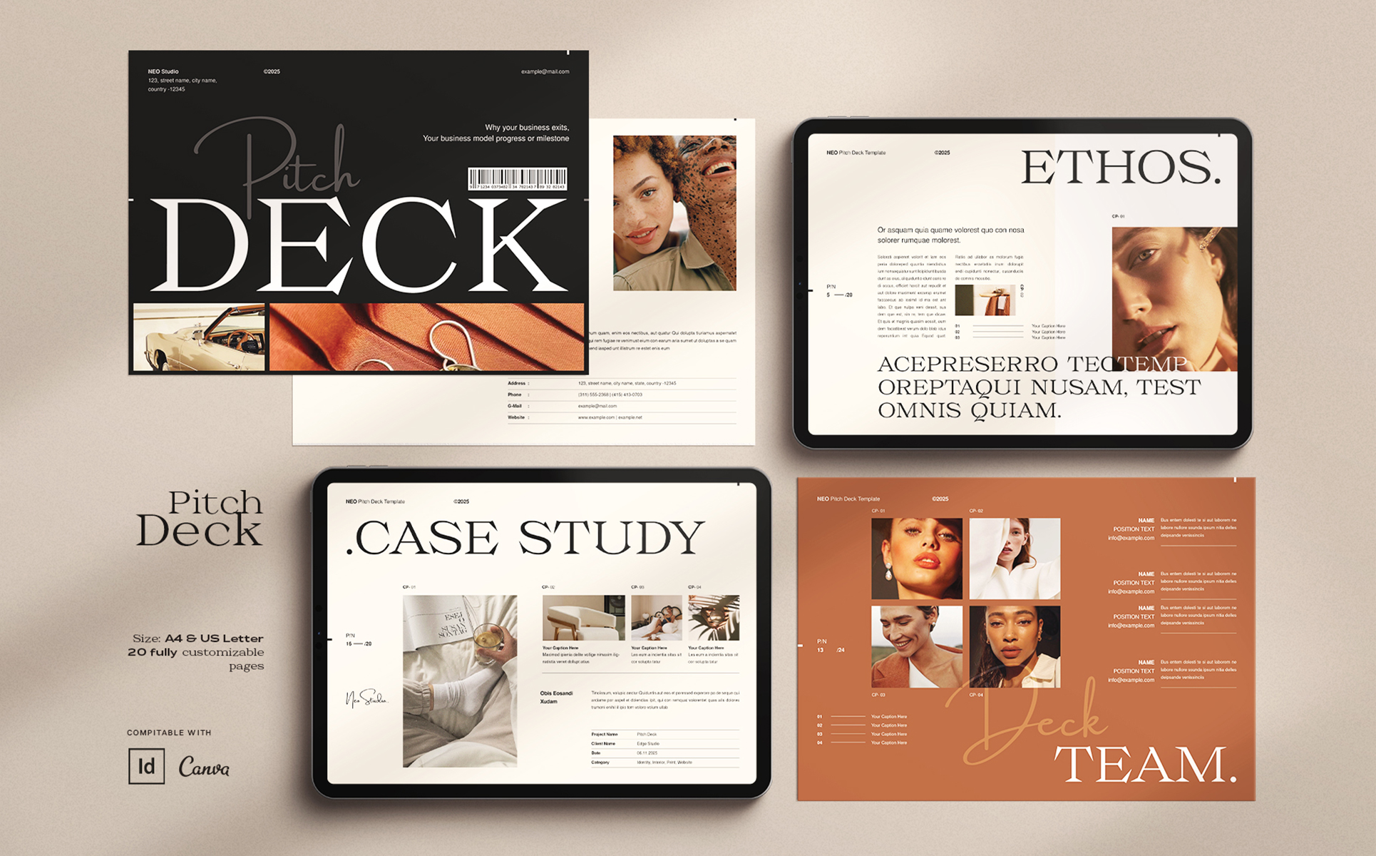The 20 page Pitch is an Adobe InDesign and Canva compatible template, designed with a minimal aesthetic in mind, perfectly suited to fashion or lifestyle branding. This Pitch template will look as good on screen as printed.