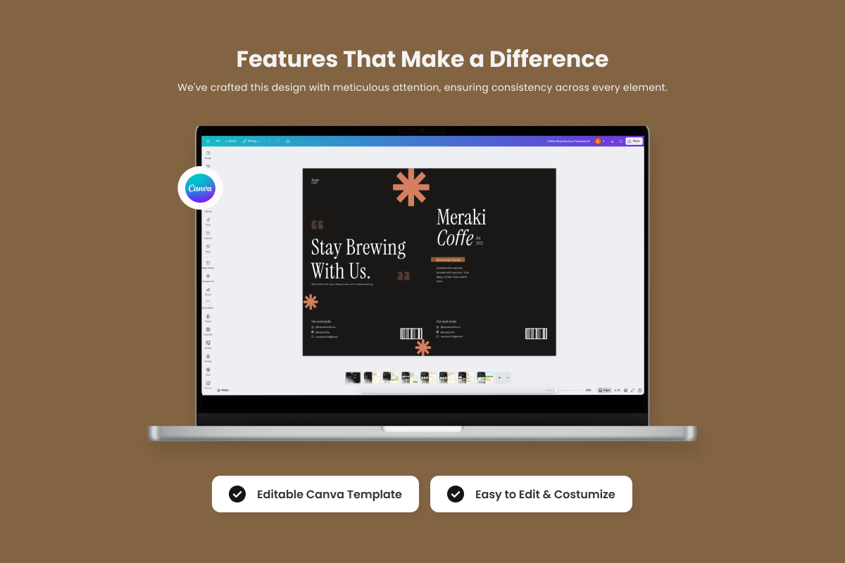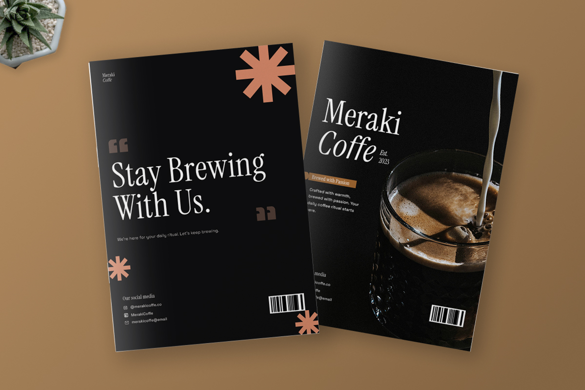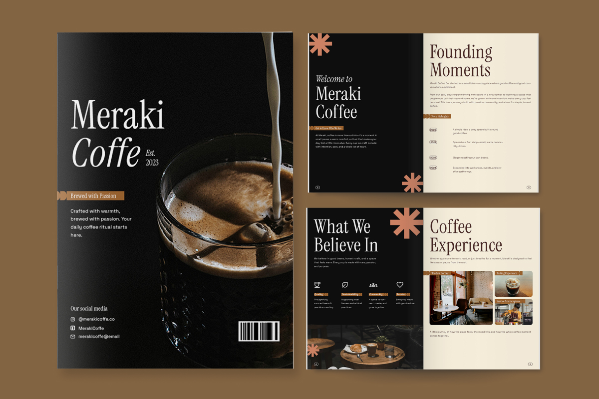This Coffee Shop Brochure Template is designed with a modern editorial approach for coffee shops seeking a professional, premium look. The combination of vintage-modern serif, clean sans-serif, and a caramel-espresso color palette creates a warm, artistic, and high-end feel. Photos of coffee and the café interior are displayed in a neat grid layout and ample whitespace, making the brand message appear more focused and elegant.