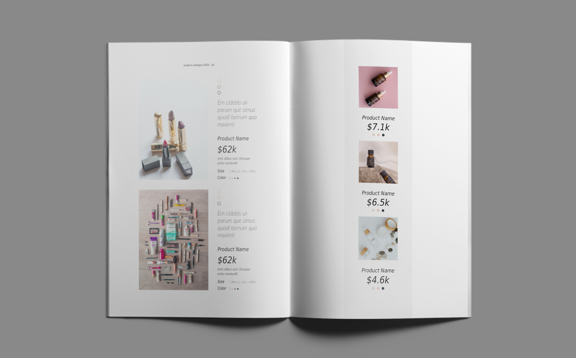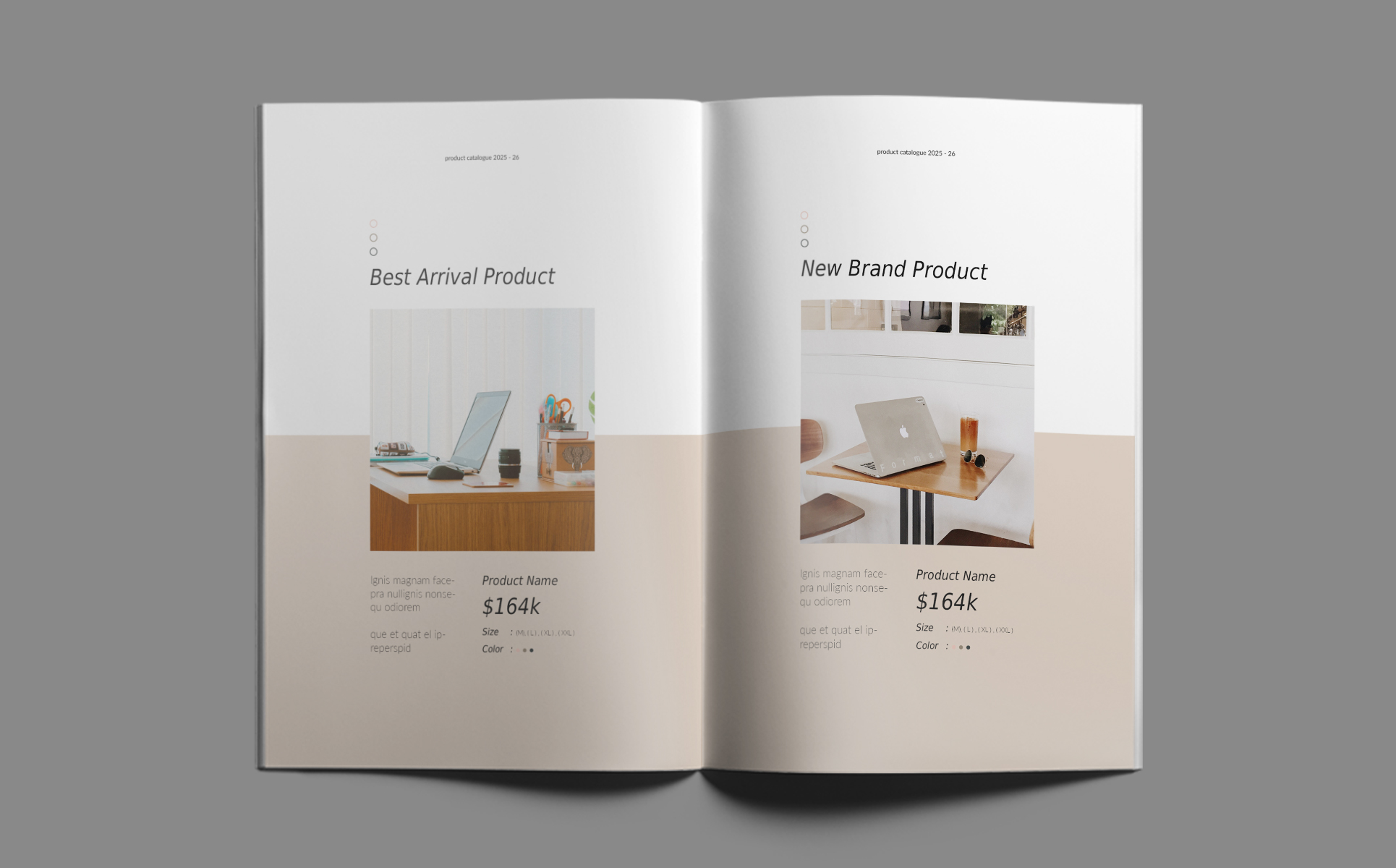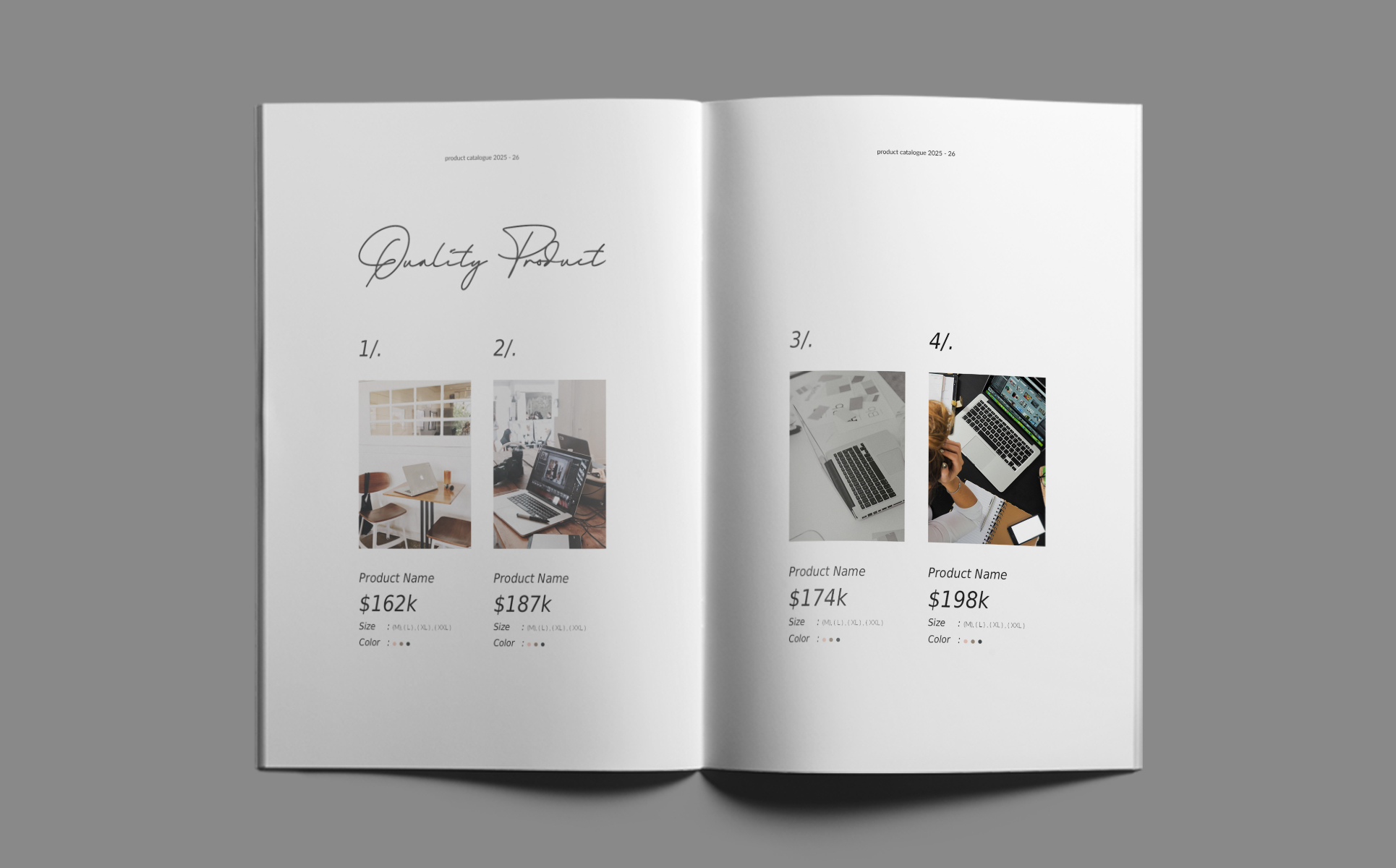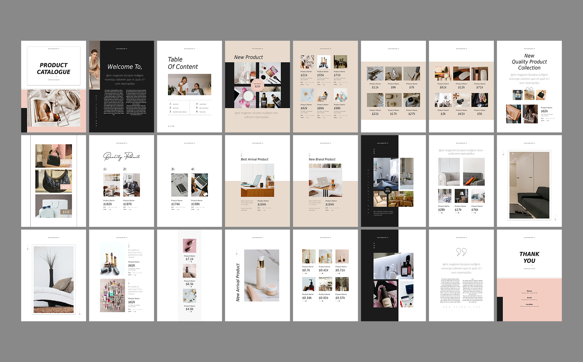 The Product Catalog Template. Very Easy To Use And Customise. Product Catalog designed using Adobe Photoshop_CC format. Can used for portfolio, brochure or catalog. Each page features unique layouts with contemporary typography and then many layouts for the images with titles and descriptions.