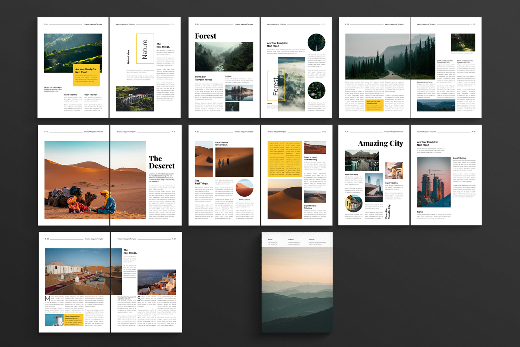 Travel & Vacation Magazine Template is clean, modern, and professional with strong typography that makes your catalog look professional. It’s created in Adobe InDesign, Microsoft Word and Affinity Suite (Affinity Publisher, Affinity Designer and Affinity Photo) with 32 pages of documents. This template is suitable for explore, minimal, magazine, travel magazine, luxury magazine, luxury travel, vacation magazine, portfolio, travel and magazine. It comes in two sizes, A4 & US Letter Size. You can easily change the images, fonts, and colors. It is completely customizable to suit your brand’s colors and corporate fonts.