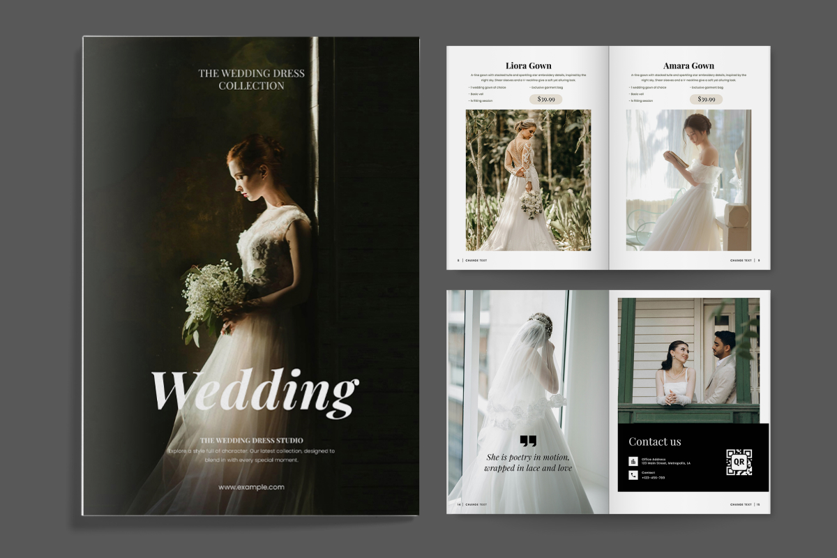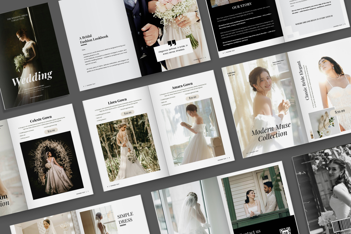 This wedding lookbook brochure is crafted to elevate any bridal fashion presentation with a clean, luxurious editorial layout. With soft tones, high-end typography, and romantic minimalism, it's ideal for showcasing gown collections, brand stories, or styled photoshoots. Whether you're targeting brides-to-be or professional stylists, this elegant lookbook ensures your visuals speak sophistication and charm.