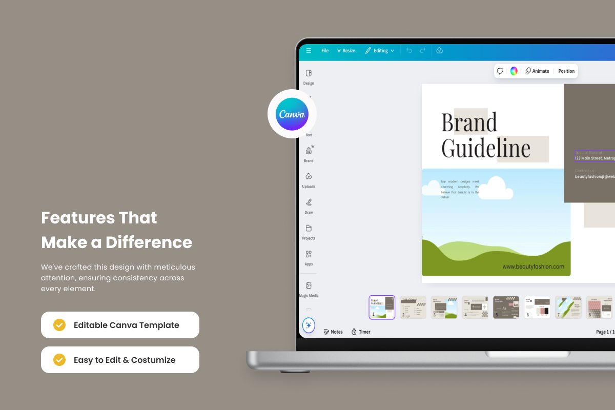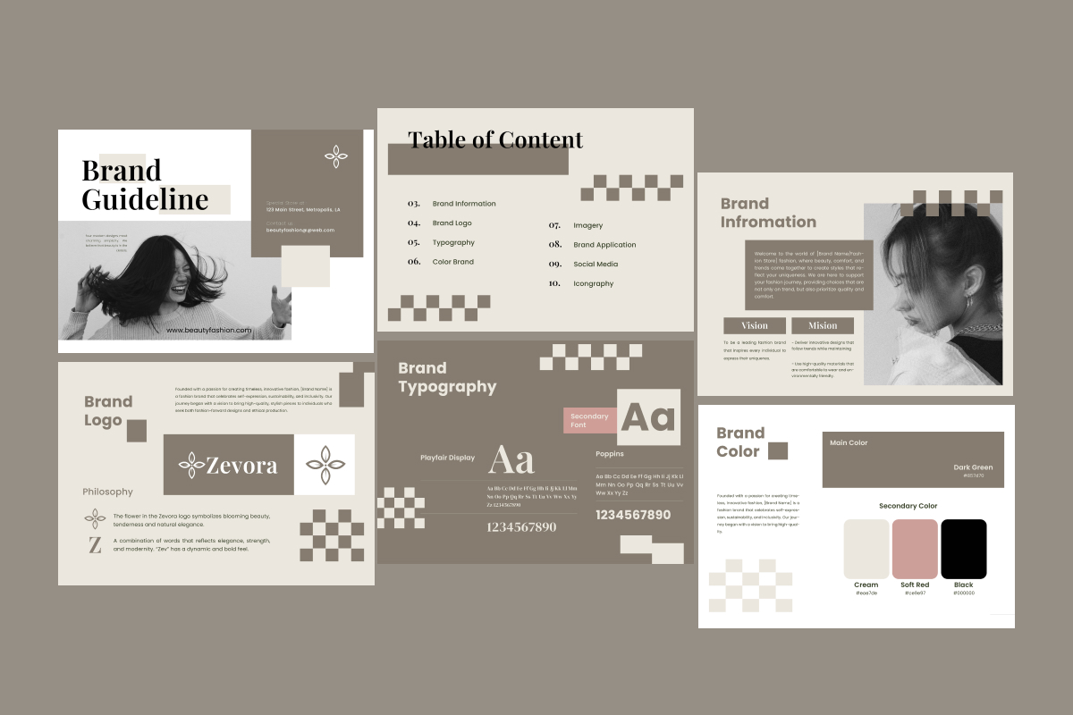 Define your fashion brand’s visual identity with Zevora, a meticulously crafted brand guideline that blends modern aesthetics with vintage inspiration. Featuring elegant typography, pastel retro color palettes, and geometric layouts, this guide is perfect for fashion brands seeking a timeless, high-end appeal. Designed for graphic designers, marketers, and agencies, Zevora ensures your brand looks cohesive and professional across all platforms.