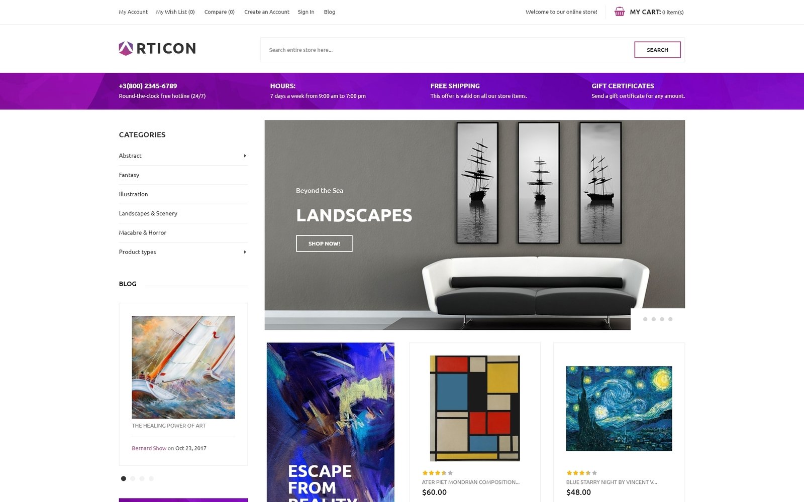Articon is a fully responsive Magento 2 theme that is ideal choice to build a functional artist, prints, art gallery or posters store. You can customize your store design to fit any special needs, which means you can add unlimited number of banners, sliders and blocks. Put a silky-smooth slider on the Home Page to showcase the best store deals and products. Moreover, a video background is also included. To help you to create easy-to-use navigation menu looking just the way that you want, the theme features a full drag&drop Mega Menu module. Also, the theme provided with premium Social Sharing and Blog modules to promote your store and improve the SEO ranking. Hit the Live Demo to see more!