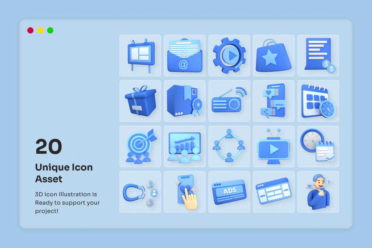 This advertising-focused 3D icon pack helps you build powerful visuals for campaigns, presentations, and reports. The icons combine a soft clay-morph aesthetic with clean edges to balance friendliness and professionalism.