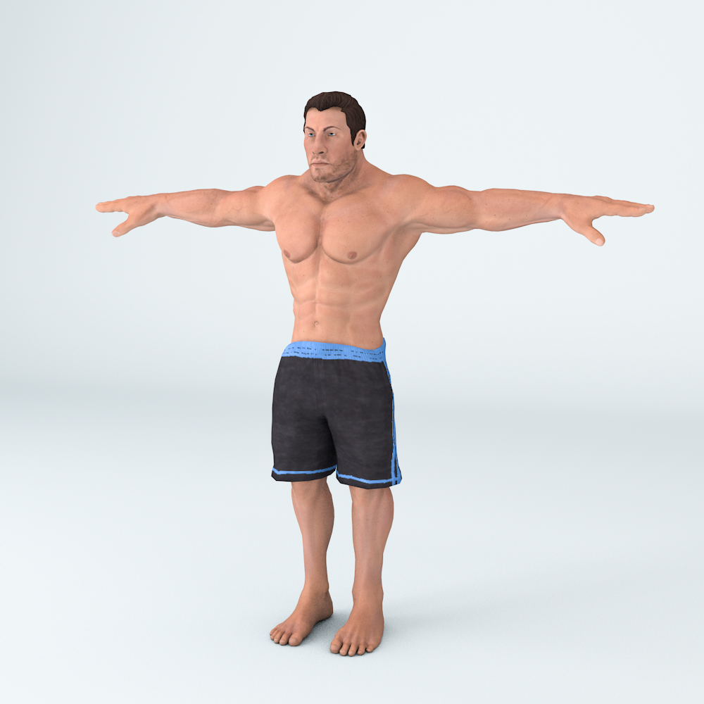 Here is the model of a high detail male character. T-pose for rigging READY FOR ANIMATION! This model is suitable for use in advertising, design visualization, forensic presentation, film, game cut scenes, etc