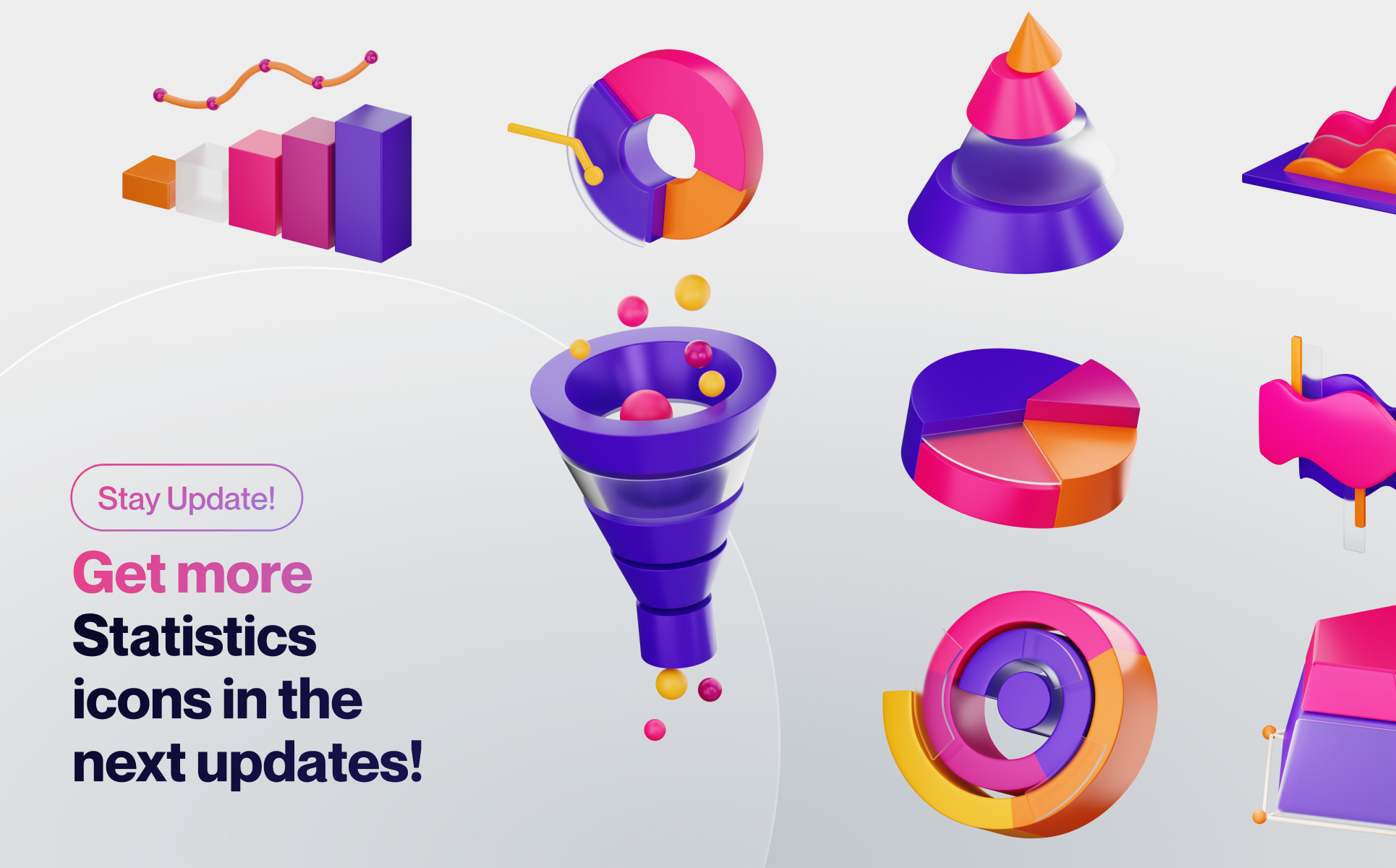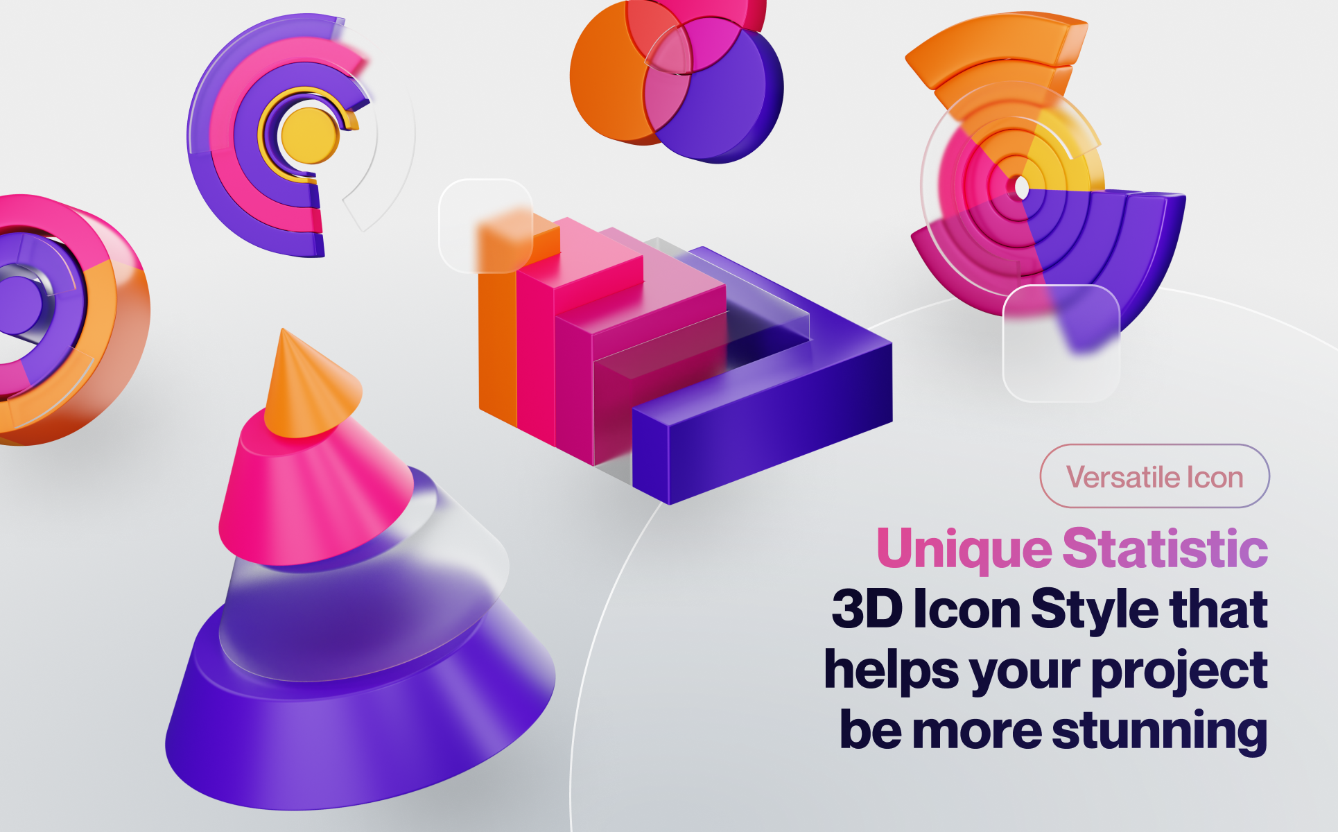 These 3D statistical charts, bar, and diagram icons are the perfect way to present data icons in your digital projects. With vibrant colors, it will create a bold and energetic impression. Featuring a range of Chart & Statistic icons such as pie, donut, line, venn, mountain, & many more. These 3D icons will be flexible to use in your design needs.