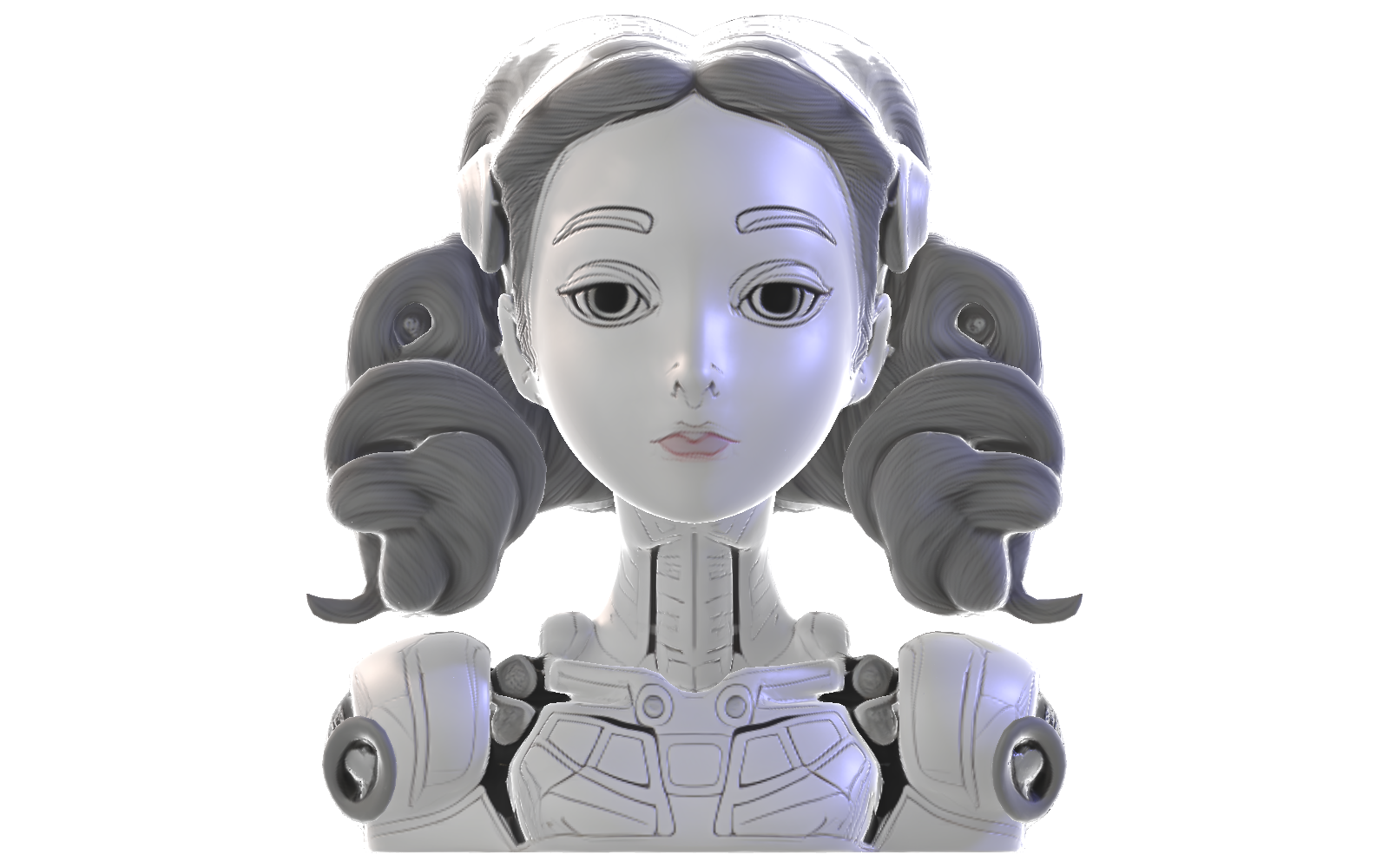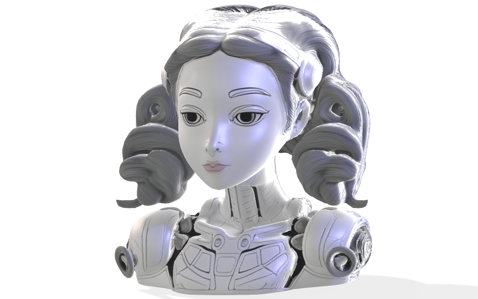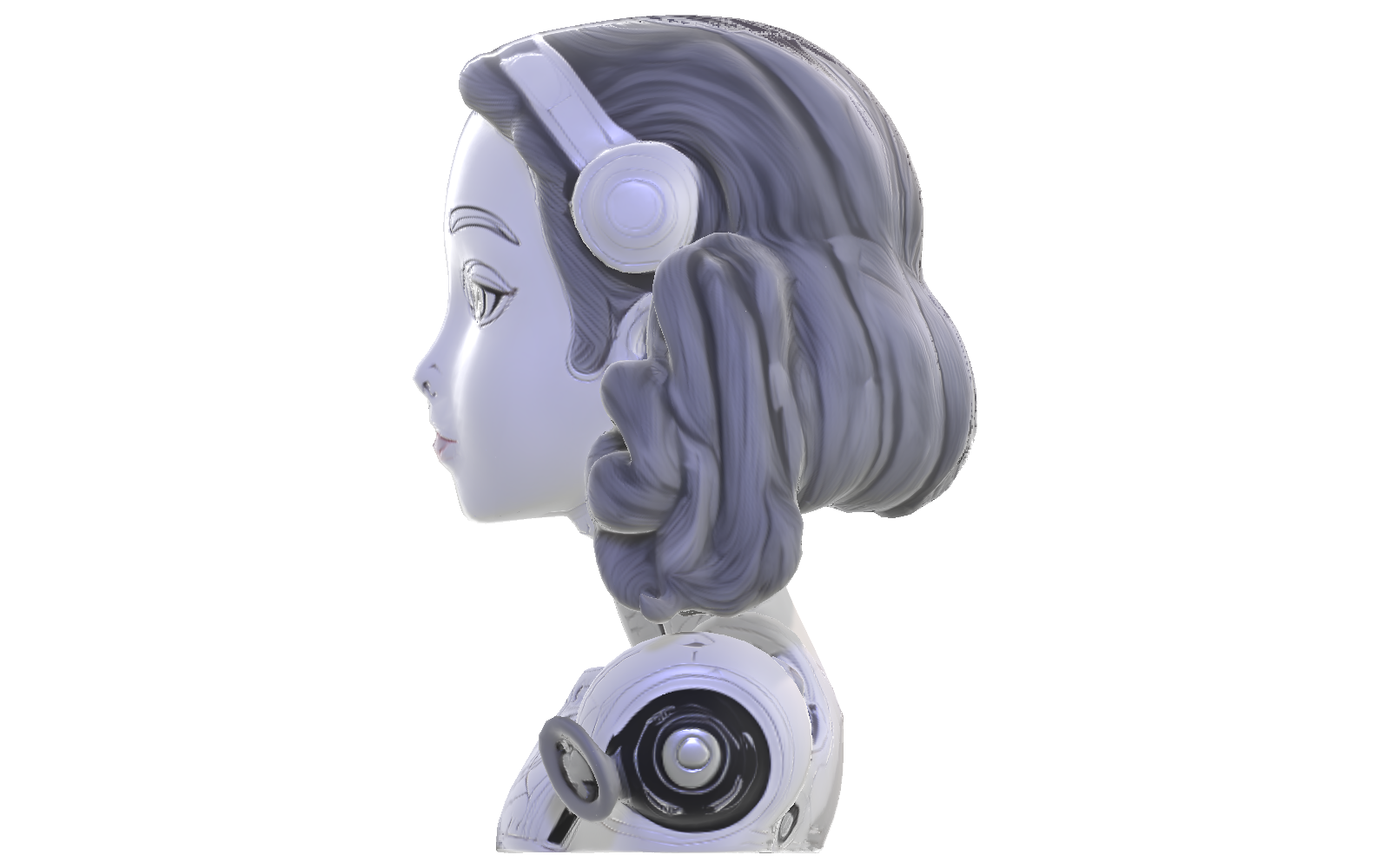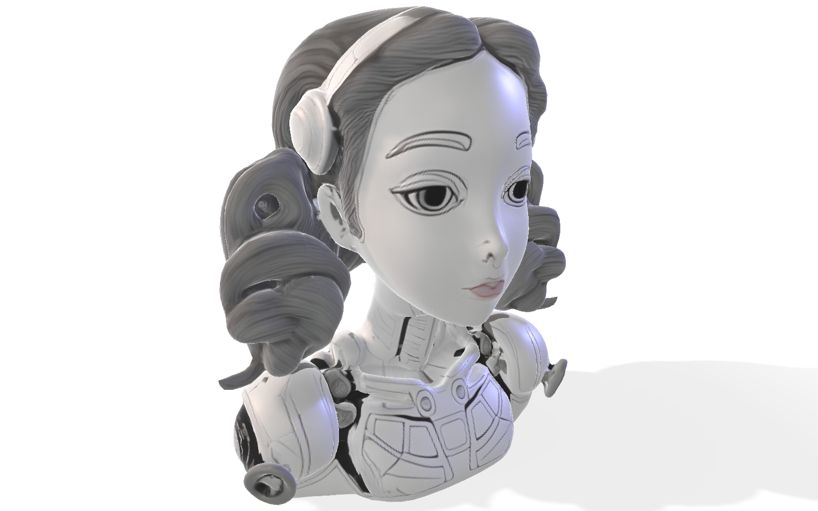This elegant female android bust combines futuristic mechanical elements with classical artistic styling. The design features a feminine face with stylized eyes and delicate features, framed by sculptural curled hair that adds visual interest and dimension. The shoulders and chest area incorporate mechanical details and panel lines that suggest advanced technology, creating an intriguing contrast with the more human-like facial features.
