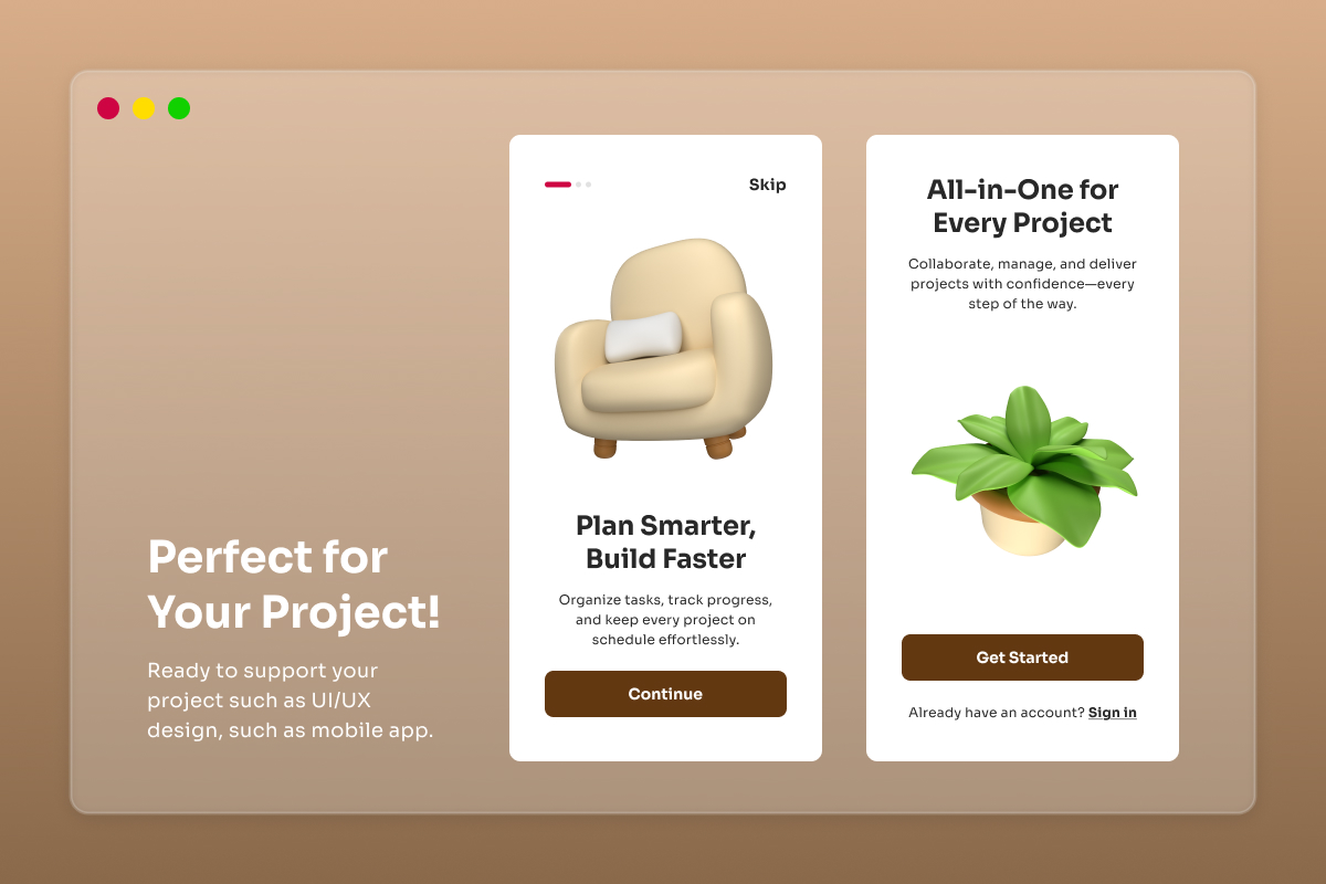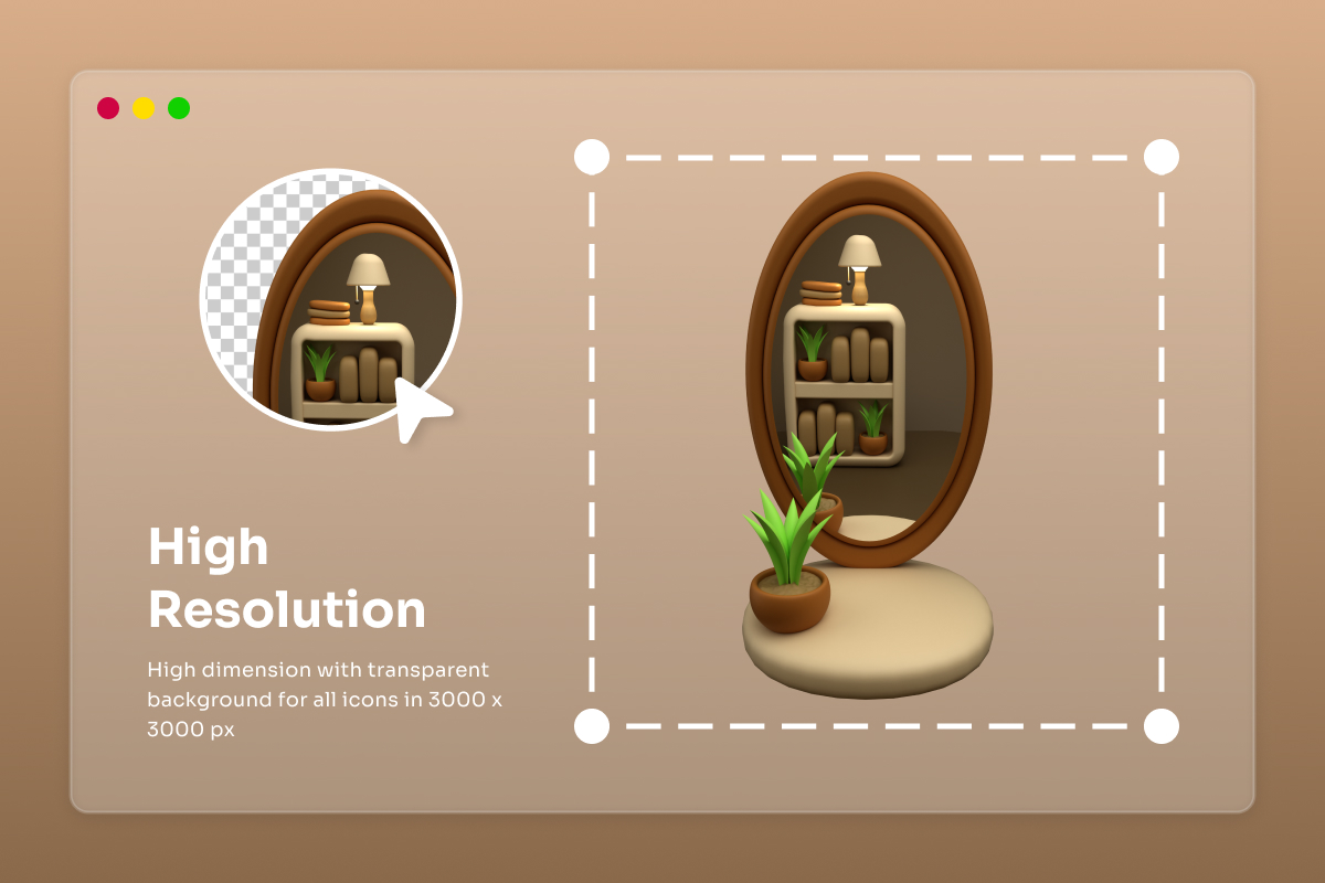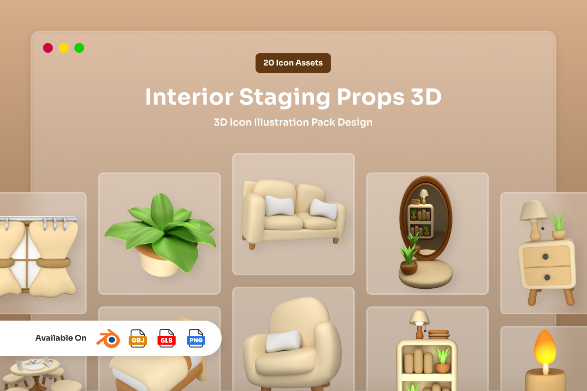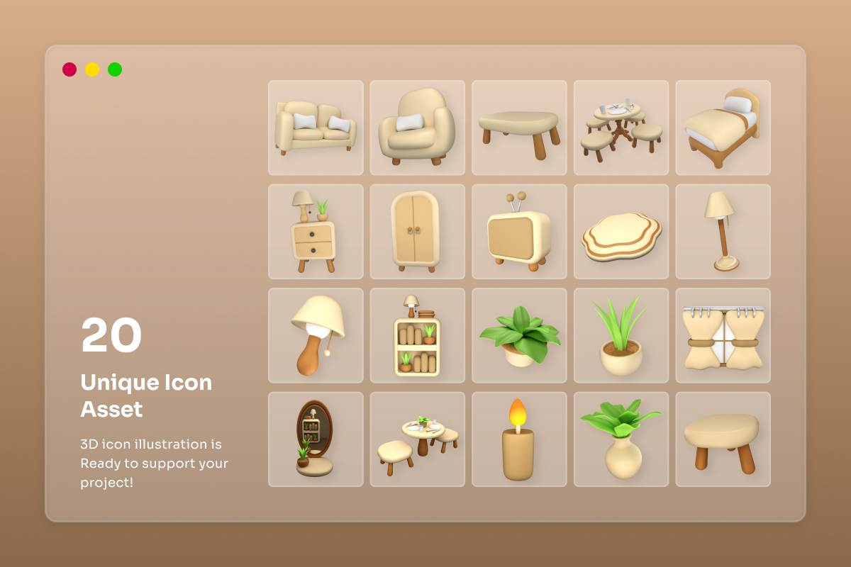 This icon pack offers a curated selection of furniture and decoration props for creating beautiful interior scenes. The soft lighting and realistic materials make them look professional yet friendly.