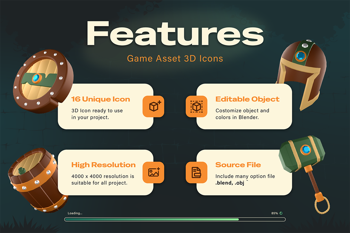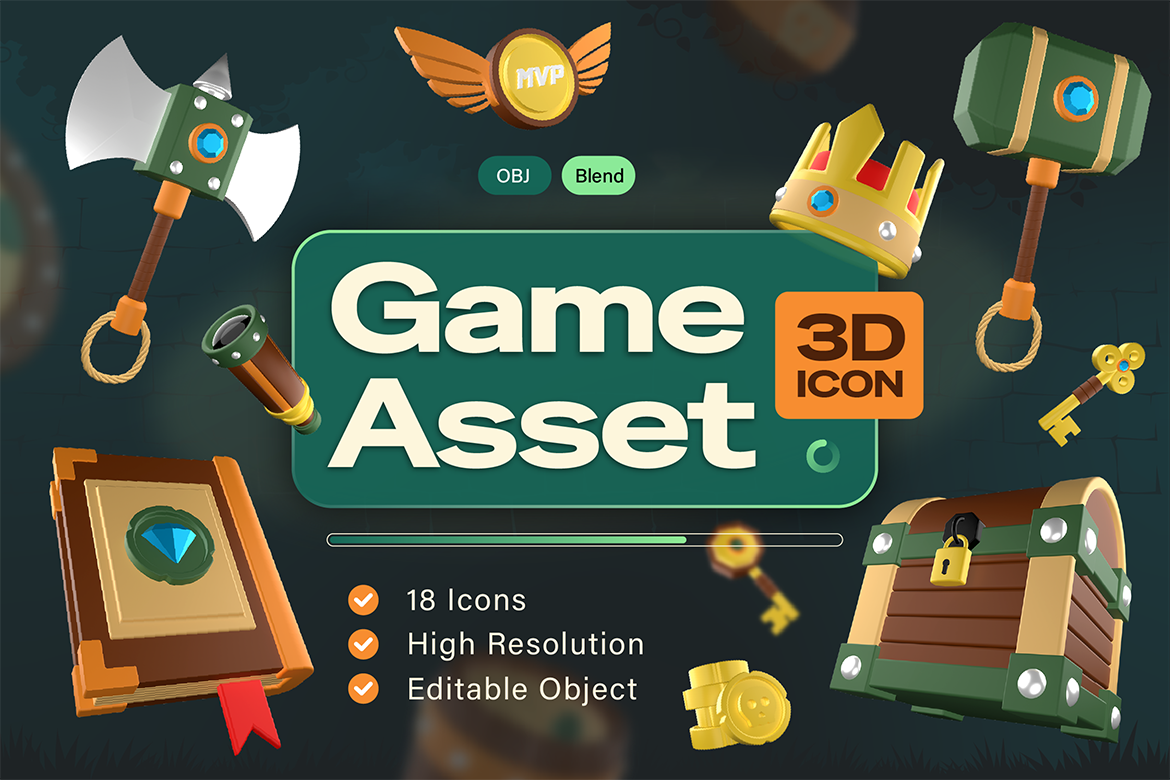 Bring your game world to life with this Game Asset 3D Icon Pack — a collection of 18 beautifully crafted icons that feel straight out of a fantasy adventure!