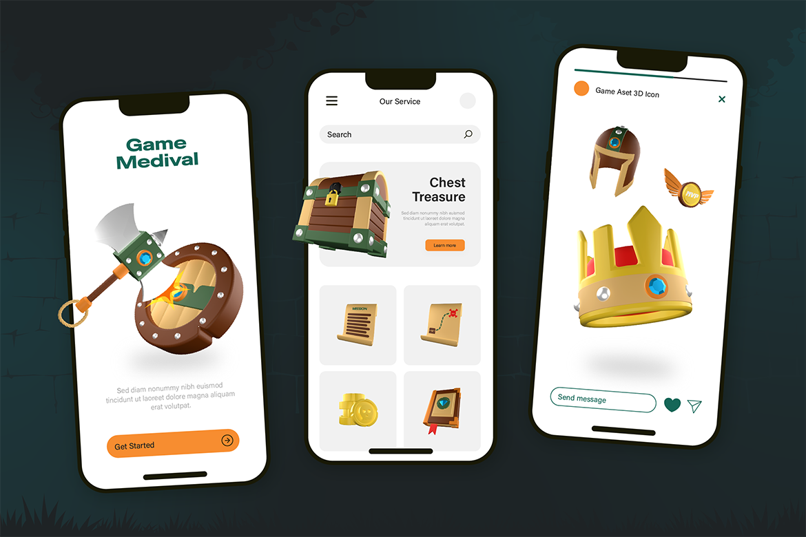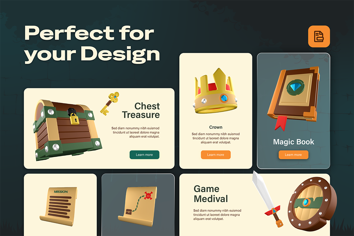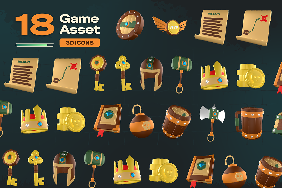 Each item, from treasure chests and swords to crowns and maps, is designed with attention to detail to make your project look more immersive and dynamic.