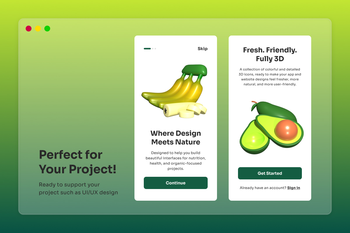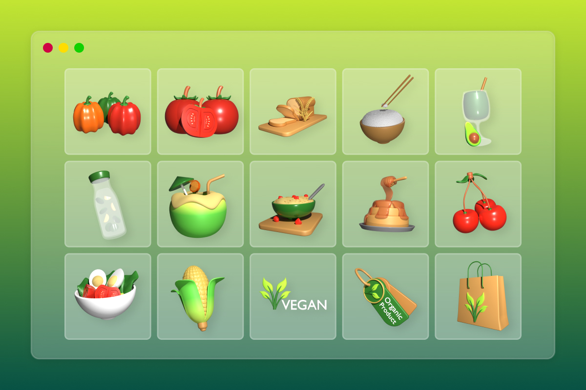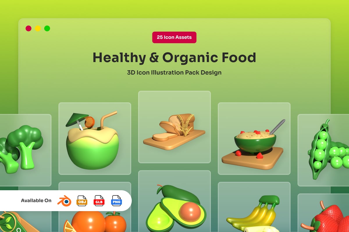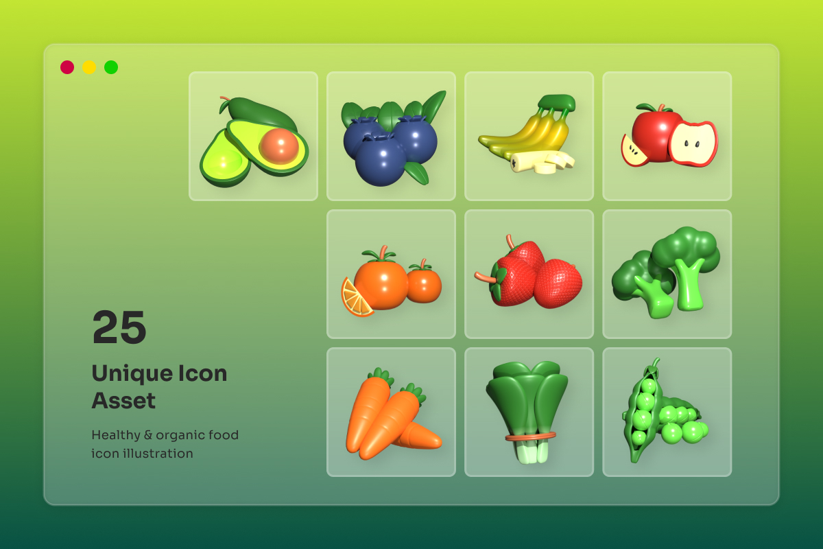 Elevate your health-conscious designs with this modern and soothing 3D icon collection. Crafted for clean UI interfaces, food infographics, and wellness presentations, this pack combines realistic organic elements with soft colors and smooth textures. Ideal for nutrition apps, farm-to-table branding, vegan stores, or lifestyle content with a natural vibe.