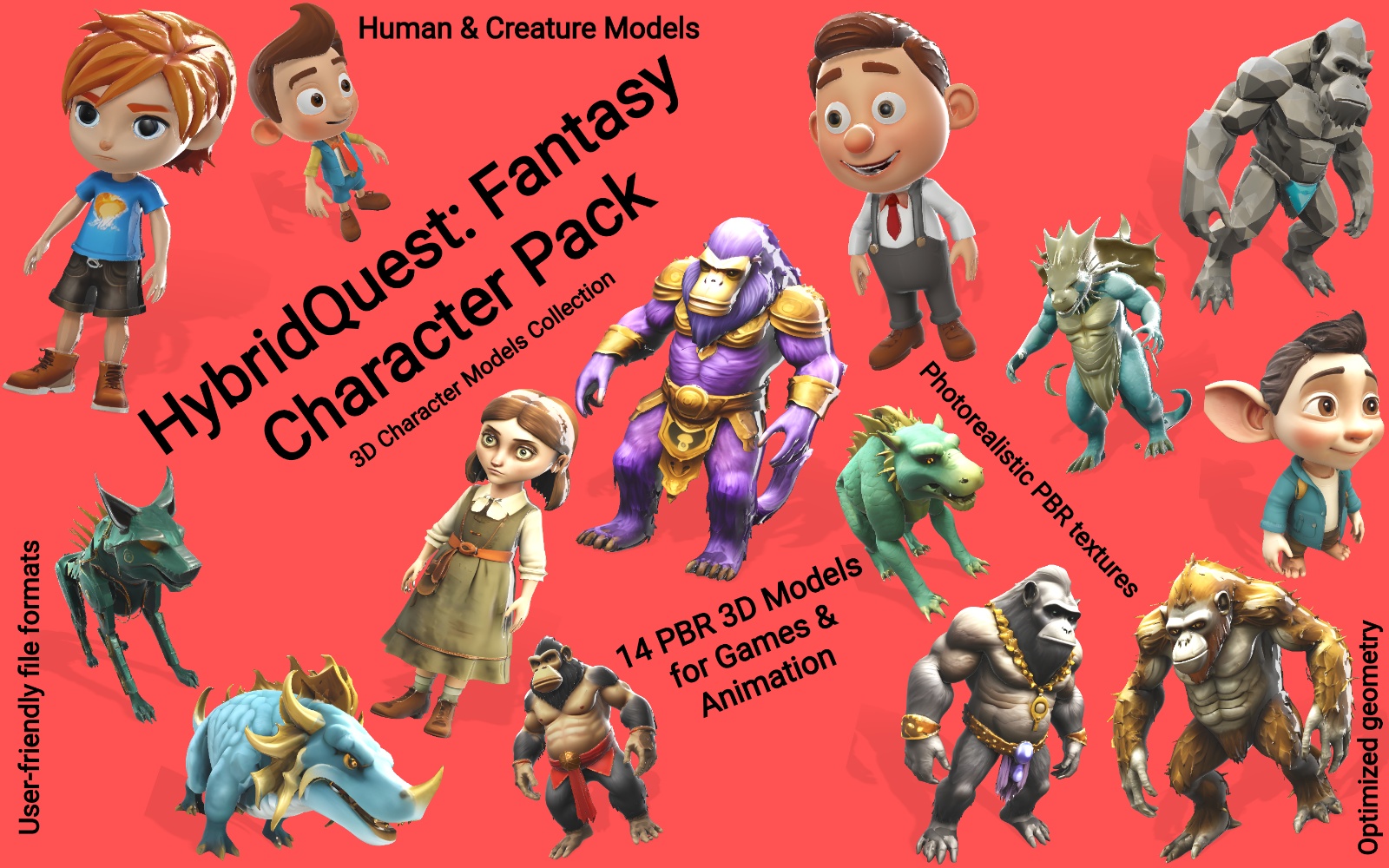 Bring your games and creative projects to life with HybridQuest, a vibrant collection of 14 highly detailed fantasy characters spanning human adventurers and mythical creatures. This diverse pack features adorable stylized human characters including a brave young boy explorer, a determined girl adventurer, a dapper businessman, a vintage-dressed girl, and a cheerful young girl. The fantastical creatures include majestic apes with varying accessories, a regal purple gorilla warrior, a menacing stone golem, colorful dragon-like creatures, and mystical wolf-inspired beasts.