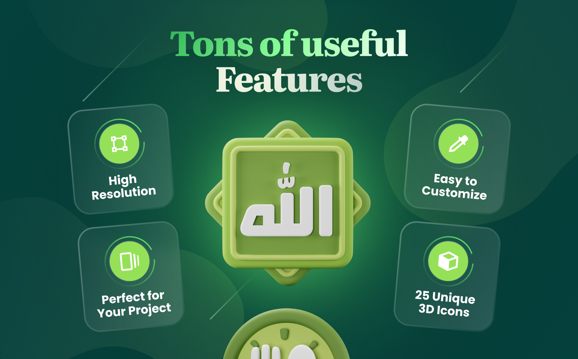 Featuring a range of typical Islamic & Ramadan icons such as mosques, lanterns, Quran, and Arabic calligraphy. This 3D icon is a beautiful way to celebrate the holy month of Ramadan. Each icon is expertly designed to capture the essence of Islam.