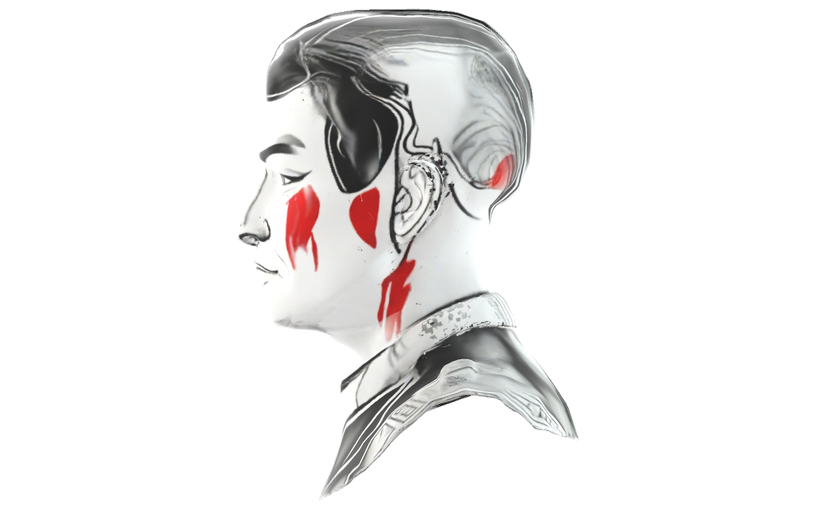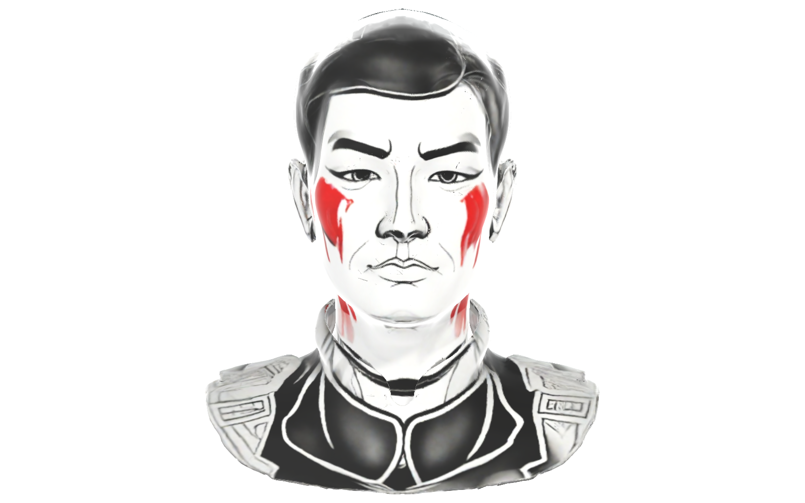 This detailed 3D bust captures the essence of a traditional Japanese warrior with ceremonial face paint. The design features striking red markings on a white face, creating a dramatic contrast that highlights the stoic expression. The character wears ornate armor with detailed shoulder plates, perfect for displaying on your desk, shelf, or as part of a themed collection.