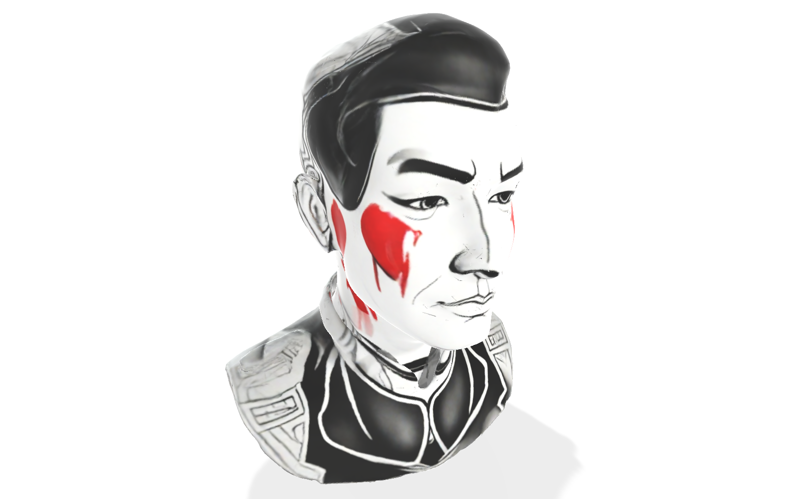 This detailed 3D bust captures the essence of a traditional Japanese warrior with ceremonial face paint. The design features striking red markings on a white face, creating a dramatic contrast that highlights the stoic expression. The character wears ornate armor with detailed shoulder plates, perfect for displaying on your desk, shelf, or as part of a themed collection.