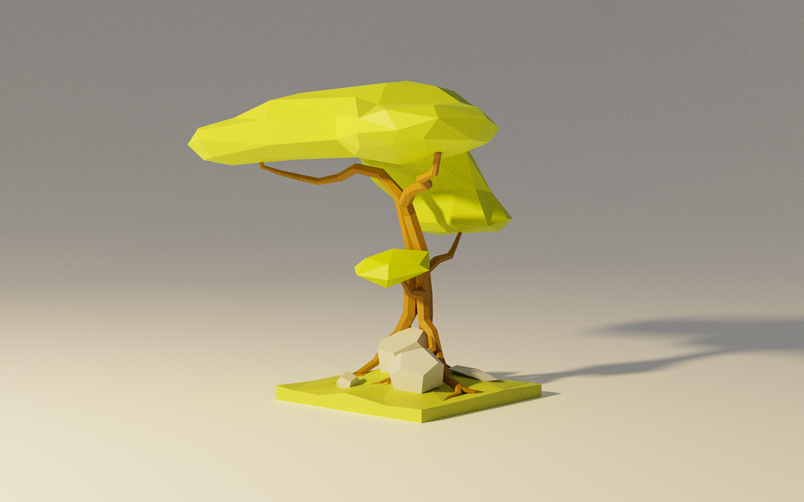 Low poly model of a jungle tree. It was made it in Blender 2.82. It can be used as an asset in video games or in your own scenes. In the .zip file I included 2 .obj files one contains a tree trunk leaves and stones as separate objects, and one in witch stone, leaves, and tree trunk as one object.