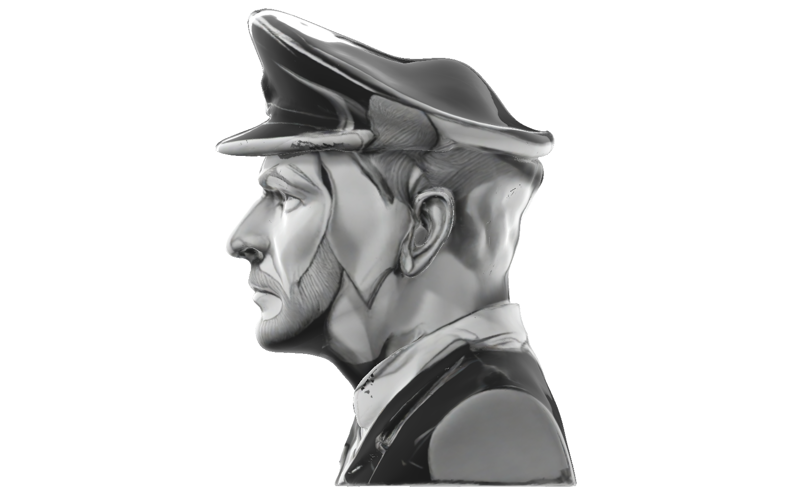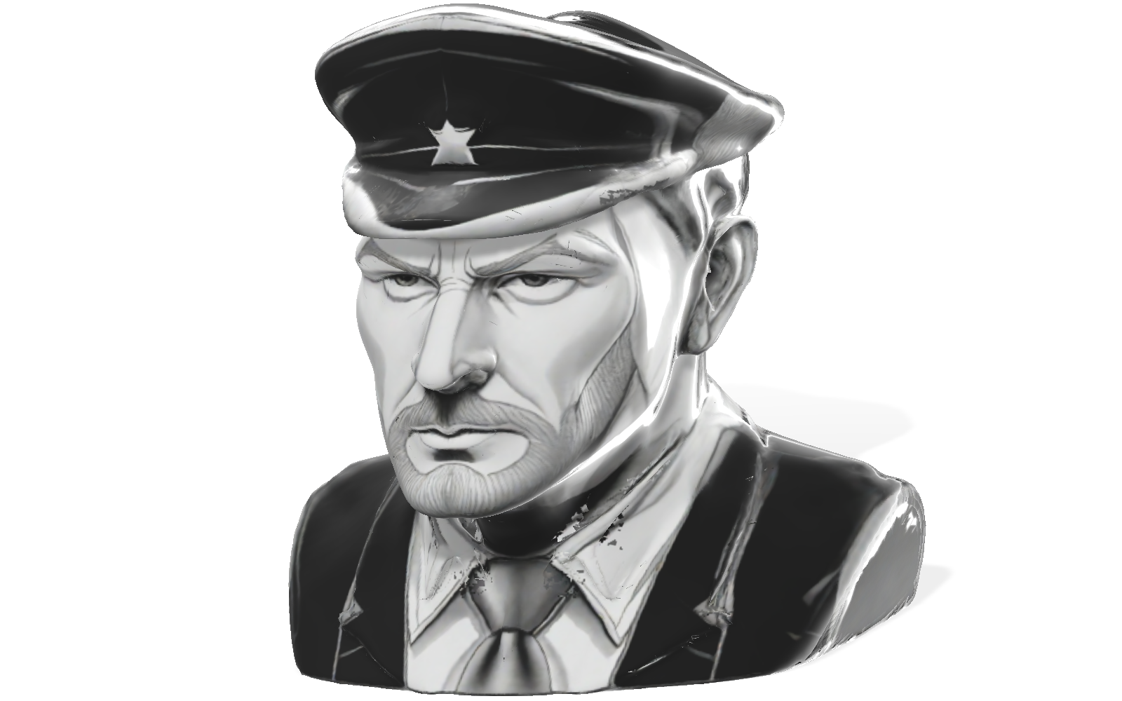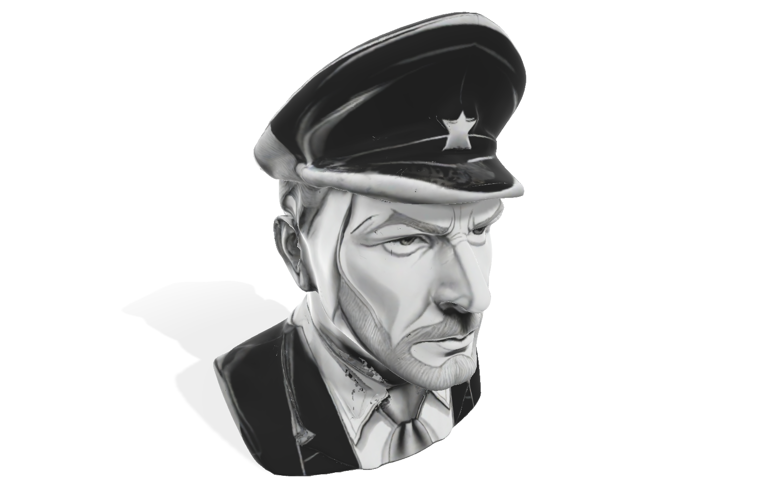 This detailed 3D printable bust features a stern military commander character with distinctive facial features and a military cap adorned with a star emblem. The design captures a serious, authoritative expression with furrowed brows and a strong jawline. Perfect for collectors, tabletop gaming enthusiasts, or as a striking decorative piece.
