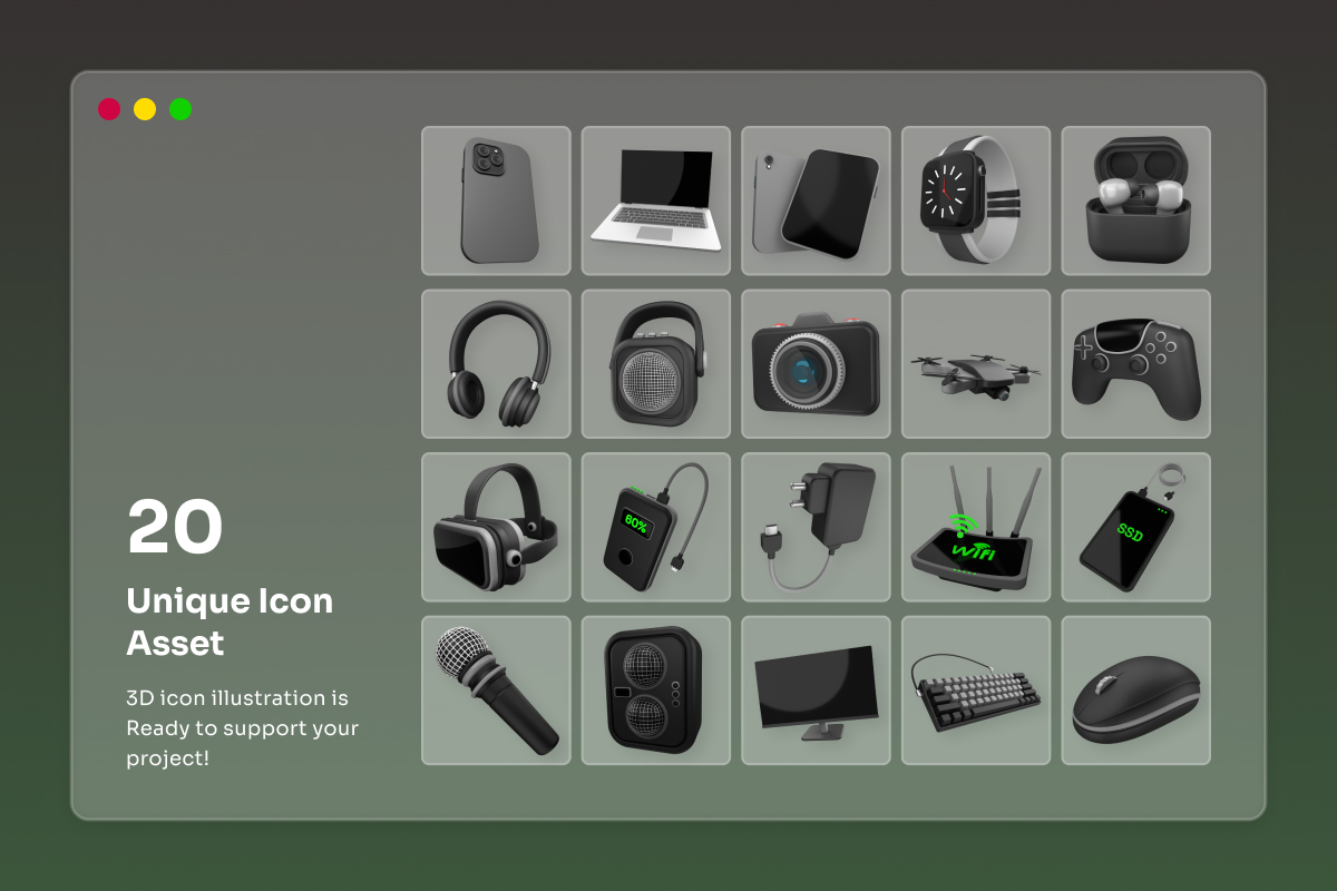Discover a sleek collection of 3D icons representing the latest tech devices from smartphones to wearables. Built in a soft-tech style, each icon uses rounded geometry and refined lighting to bring a friendly, futuristic feel. The subtle reflections and soft shadows make every object look real yet visually clean.