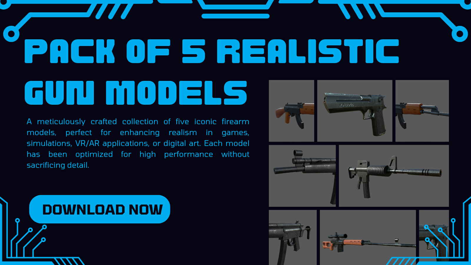 A meticulously crafted collection of five iconic firearm models, perfect for enhancing realism in games, simulations, VR/AR applications, or digital art. Each model has been optimized for high performance without sacrificing detail.