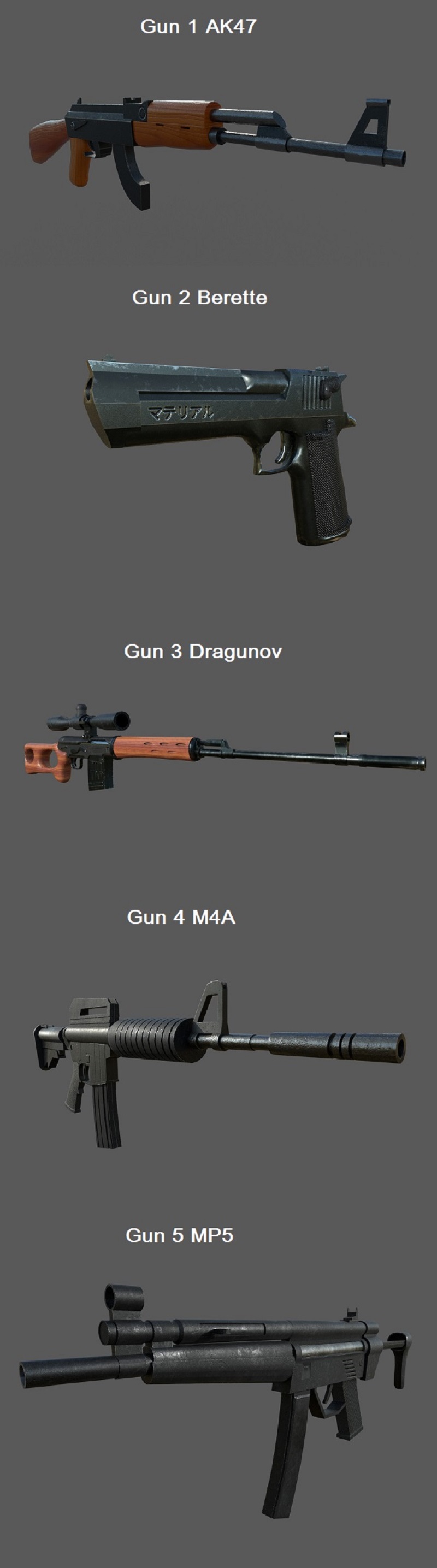 - Textures: Realistic metallic shine with tactical grips and attachments.