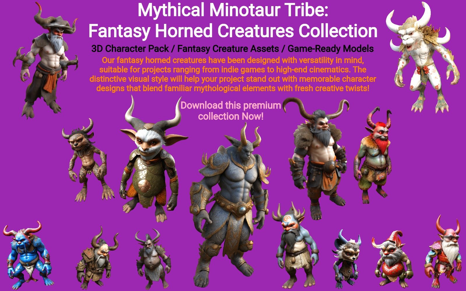 Bring your fantasy worlds to life with this diverse collection of horned mythical creatures! This pack features 14 uniquely designed minotaur-inspired characters ranging from imposing warriors to mischievous imps. Each character comes with high-quality textures, detailed armor pieces, and distinctive personalities.