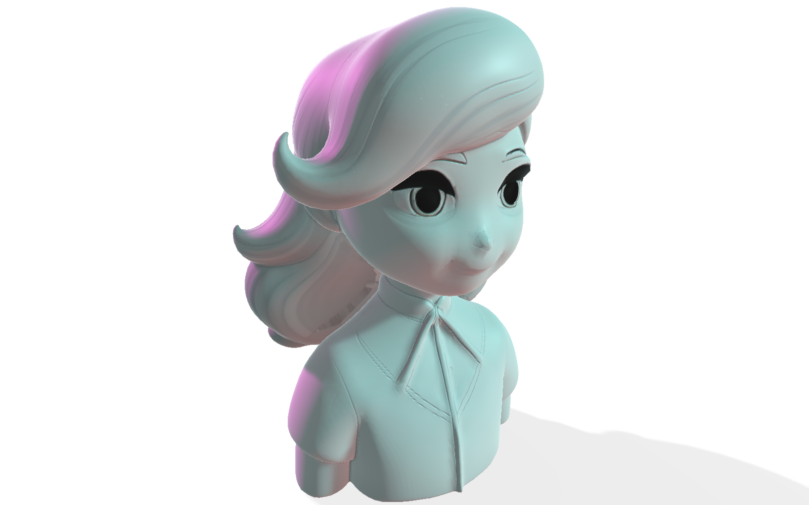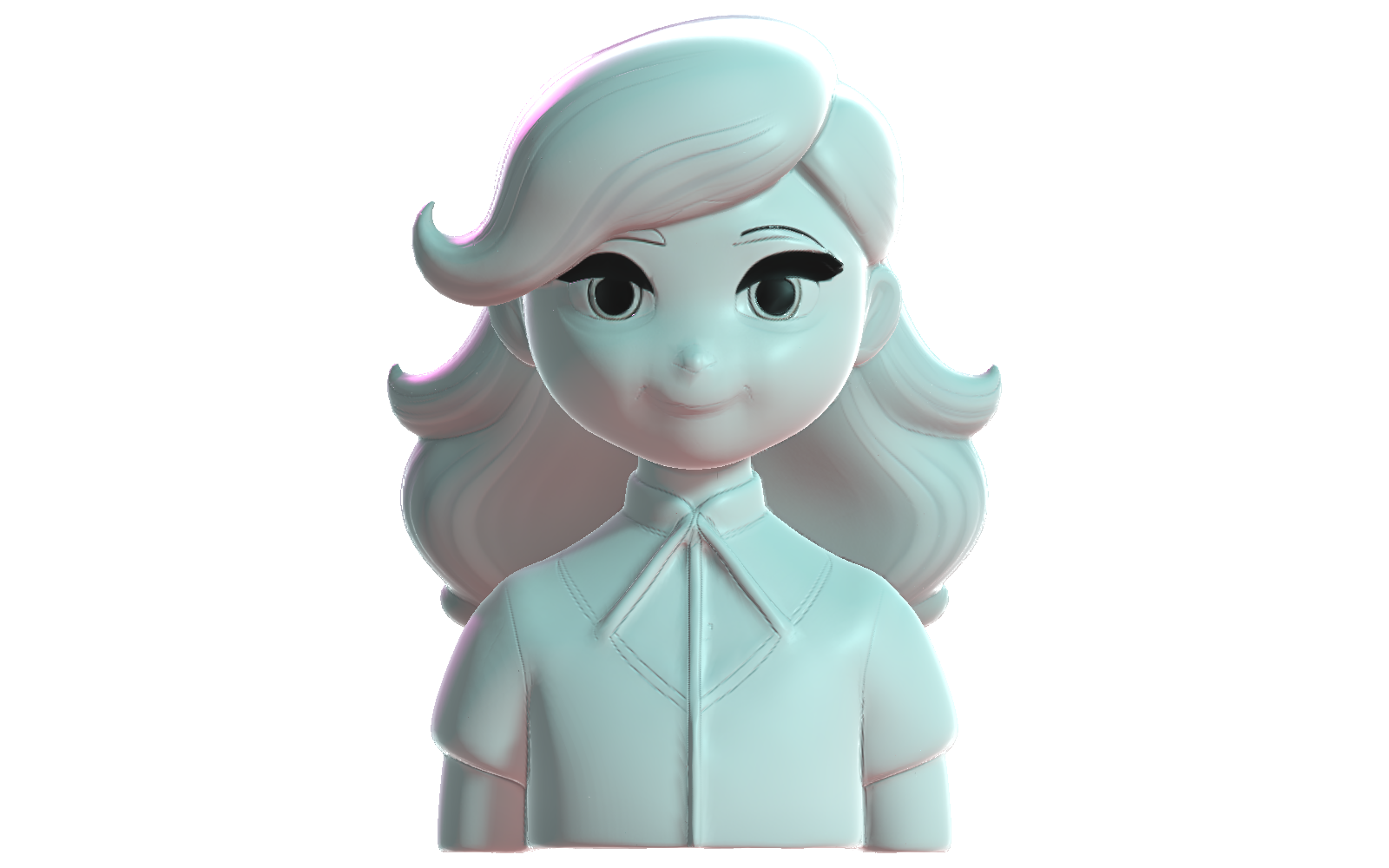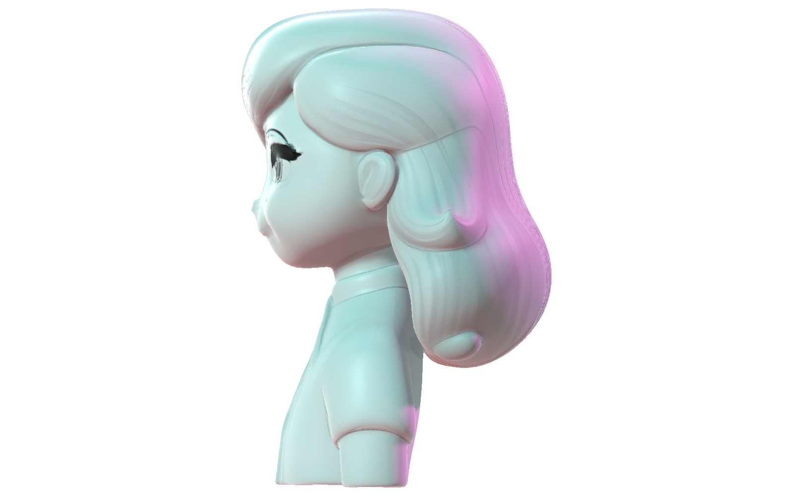 This charming 3D design features a stylized female character bust with a soft aesthetic. The design showcases a young girl with expressive eyes, distinctive winged eyeliner, and flowing hair with gentle curves that has a subtle gradient from mint to light purple tones. She's wearing what appears to be a collared shirt or blouse with a bow or tie detail at the neck, all rendered in a smooth, minimalist style with soft pastel colors.