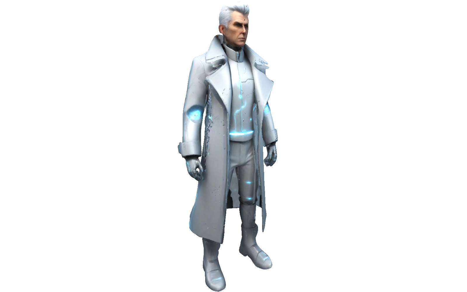 Imagine a sleek, futuristic figure wrapped in a long, stylish coat with glowing accents and a confident stance. This design blends sharp, modern lines with a touch of sci-fi flair. The coat’s panels and high-tech details give it a sophisticated look, making it an eye-catching collectible or display piece.