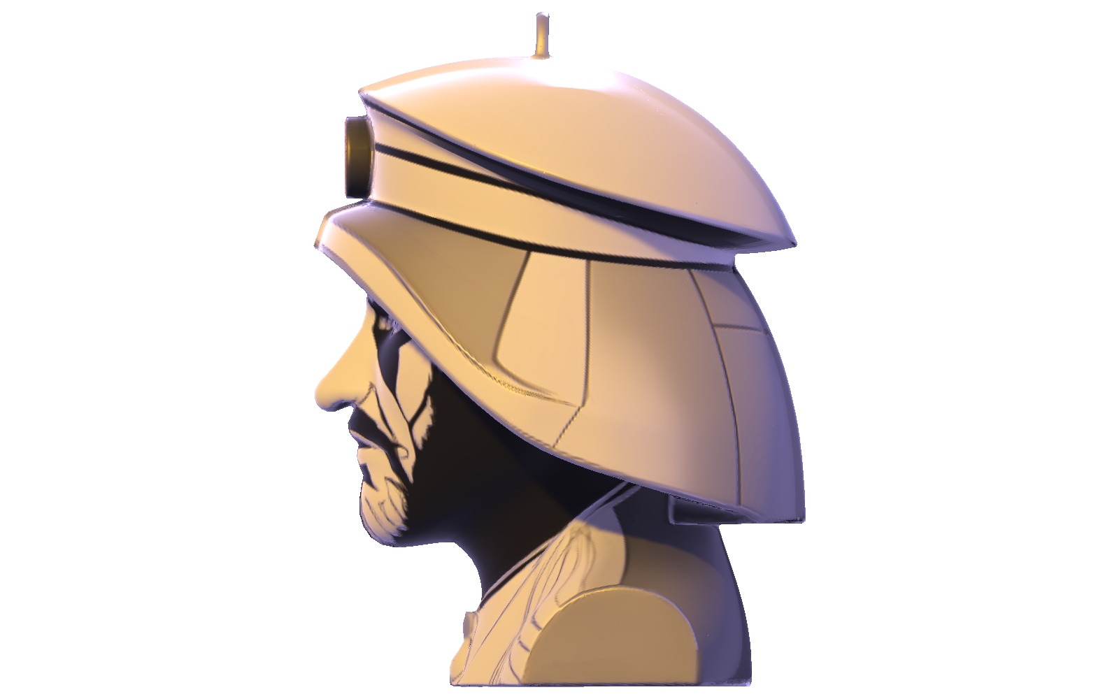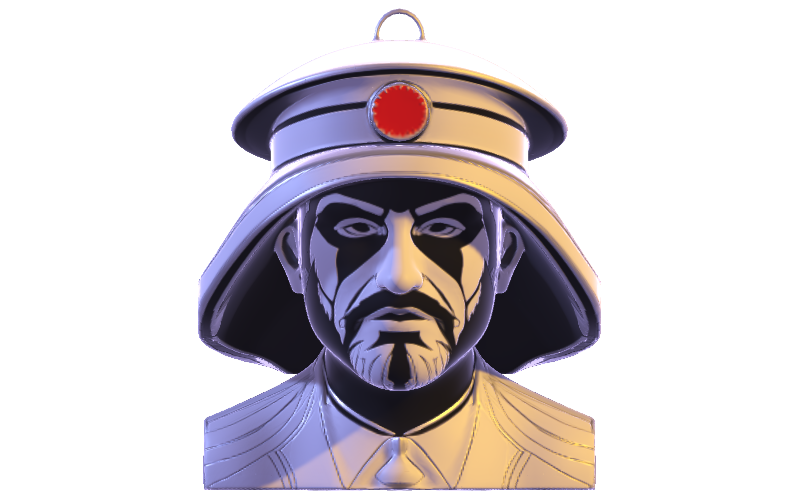 Hello there! This design is a stylized bust featuring a regal, somewhat futuristic commander’s face. He wears a prominent hat with a circular emblem (in bright red) at the front, giving the piece a bold focal point. A loop on top makes it convenient to hang or display. It’s perfect as a decorative ornament or a collectible figure that showcases both artistic flair and a bit of sci-fi/fantasy inspiration.