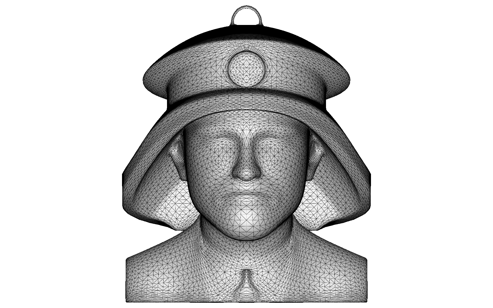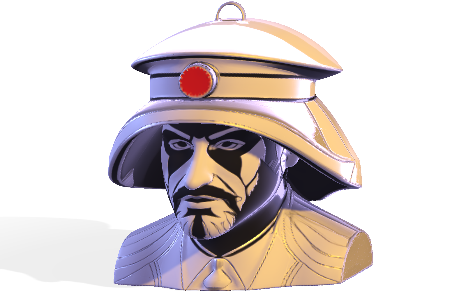 Hello there! This design is a stylized bust featuring a regal, somewhat futuristic commander’s face. He wears a prominent hat with a circular emblem (in bright red) at the front, giving the piece a bold focal point. A loop on top makes it convenient to hang or display. It’s perfect as a decorative ornament or a collectible figure that showcases both artistic flair and a bit of sci-fi/fantasy inspiration.
