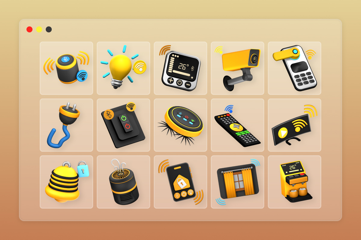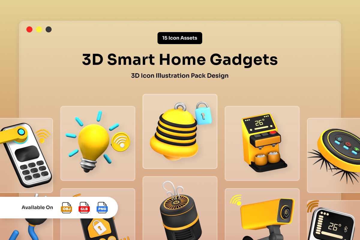 High-quality 3D icon set showcasing smart gadgets with sleek textures and subtle lighting. Designed for designers and creators who need tech-inspired assets for apps, web, and presentation use.