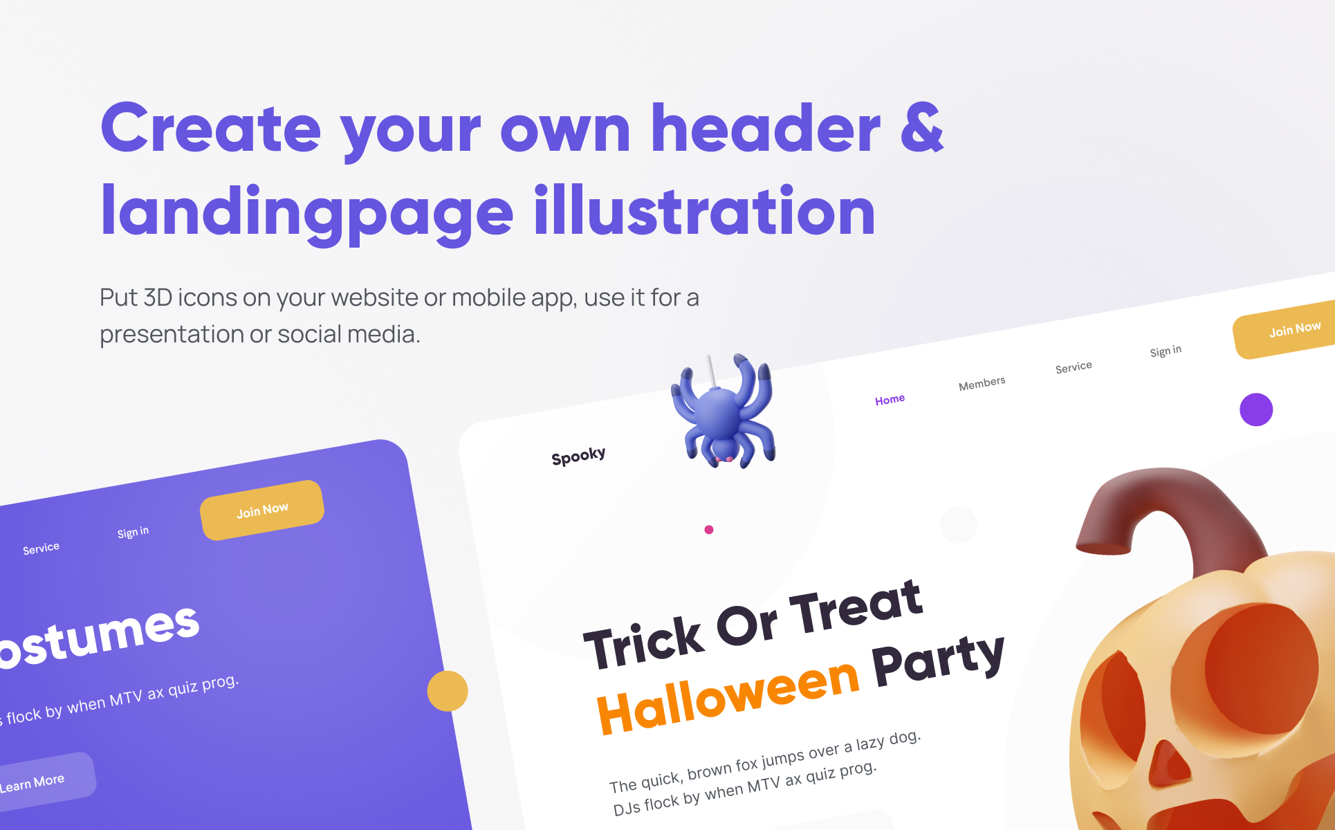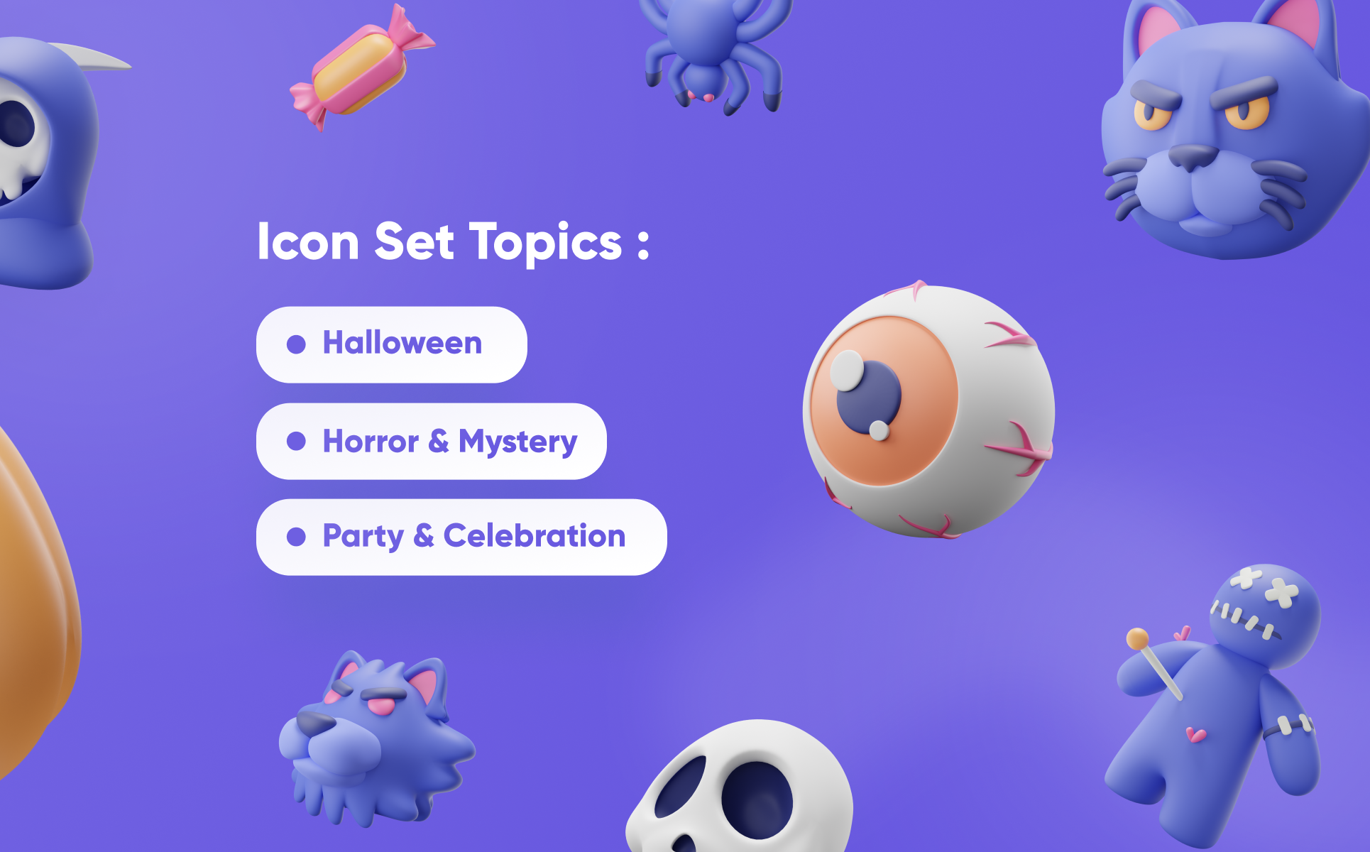 Spooky is a pack of custom 3D icons suitable for Halloween. Make your next product and project more stunning with 3D Icons.