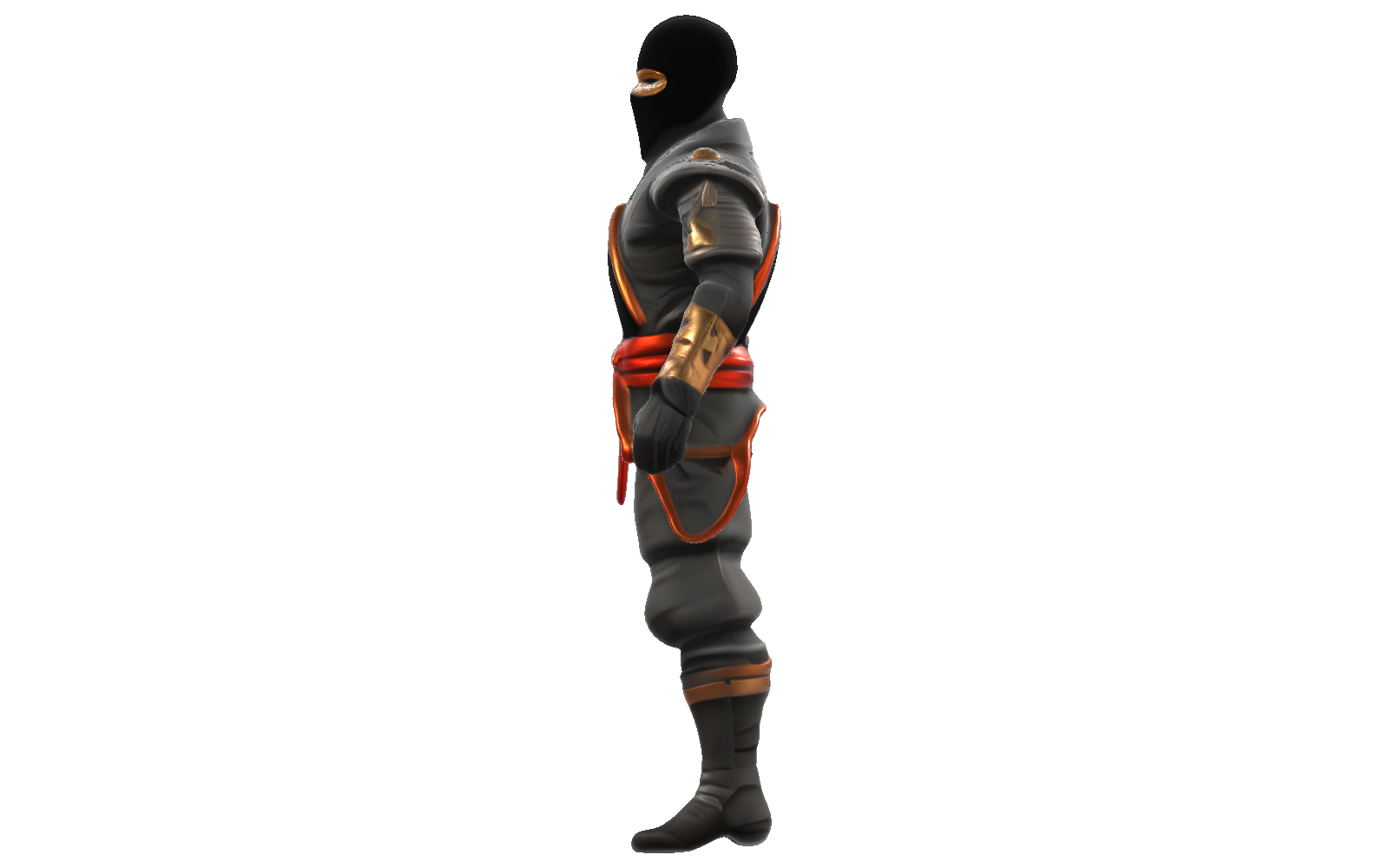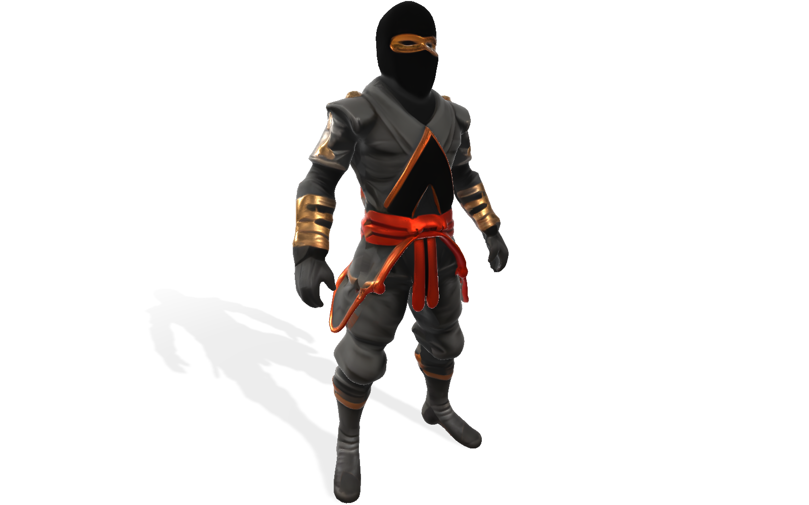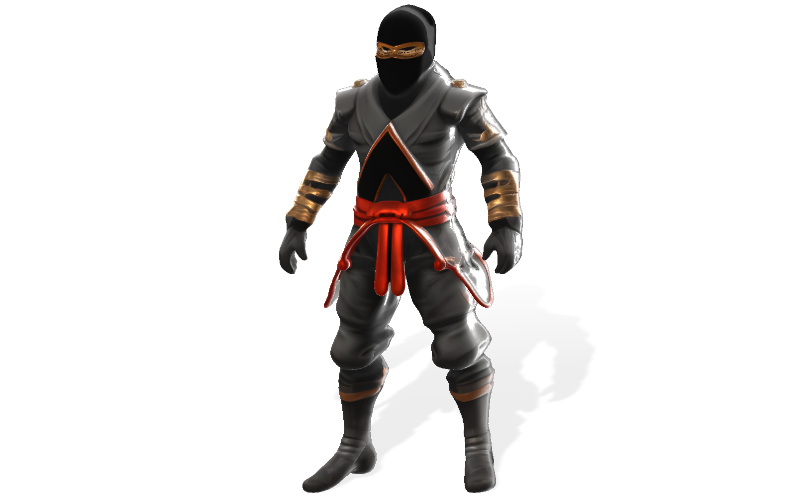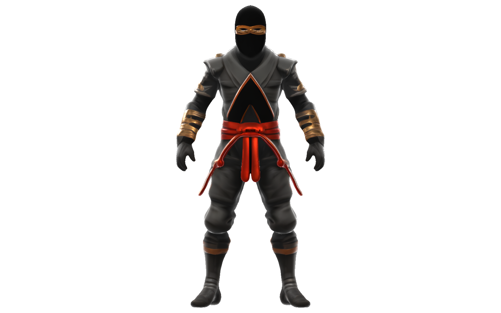 The Stealth Master Ninja Character is a detailed 3D model perfect for game developers, animators, and 3D printing enthusiasts. This ninja warrior features a traditional design with modern fantasy elements, including a sleek black mask, gray armored tunic with distinctive gold trim, and a striking red belt that adds a pop of color to the design.