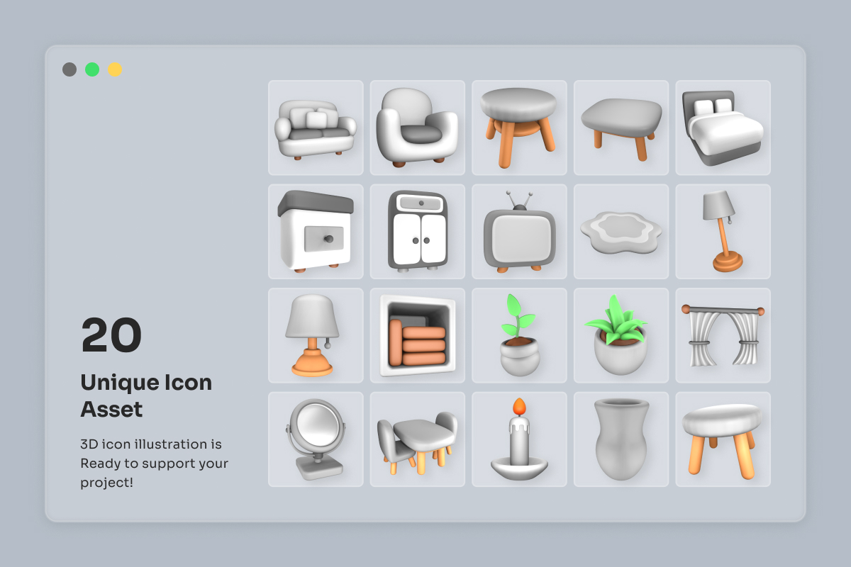 Build eye-catching room layouts with this 3D icon pack featuring tables, cabinets, chairs, and decor items. Designed with a clean and elegant look that works for multiple creative use cases.