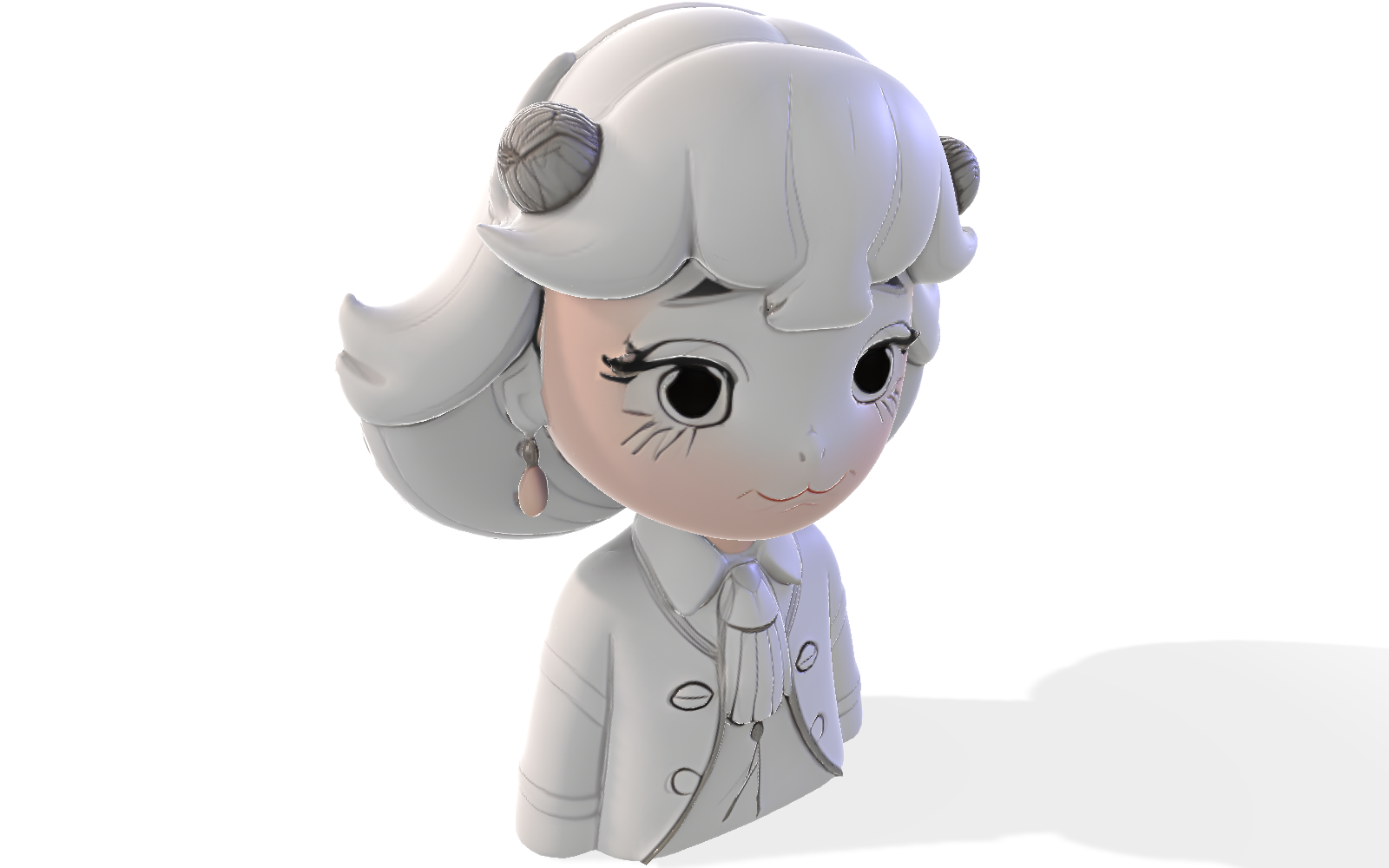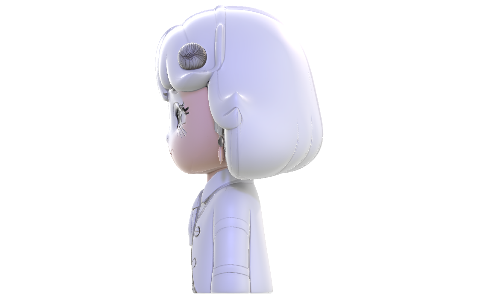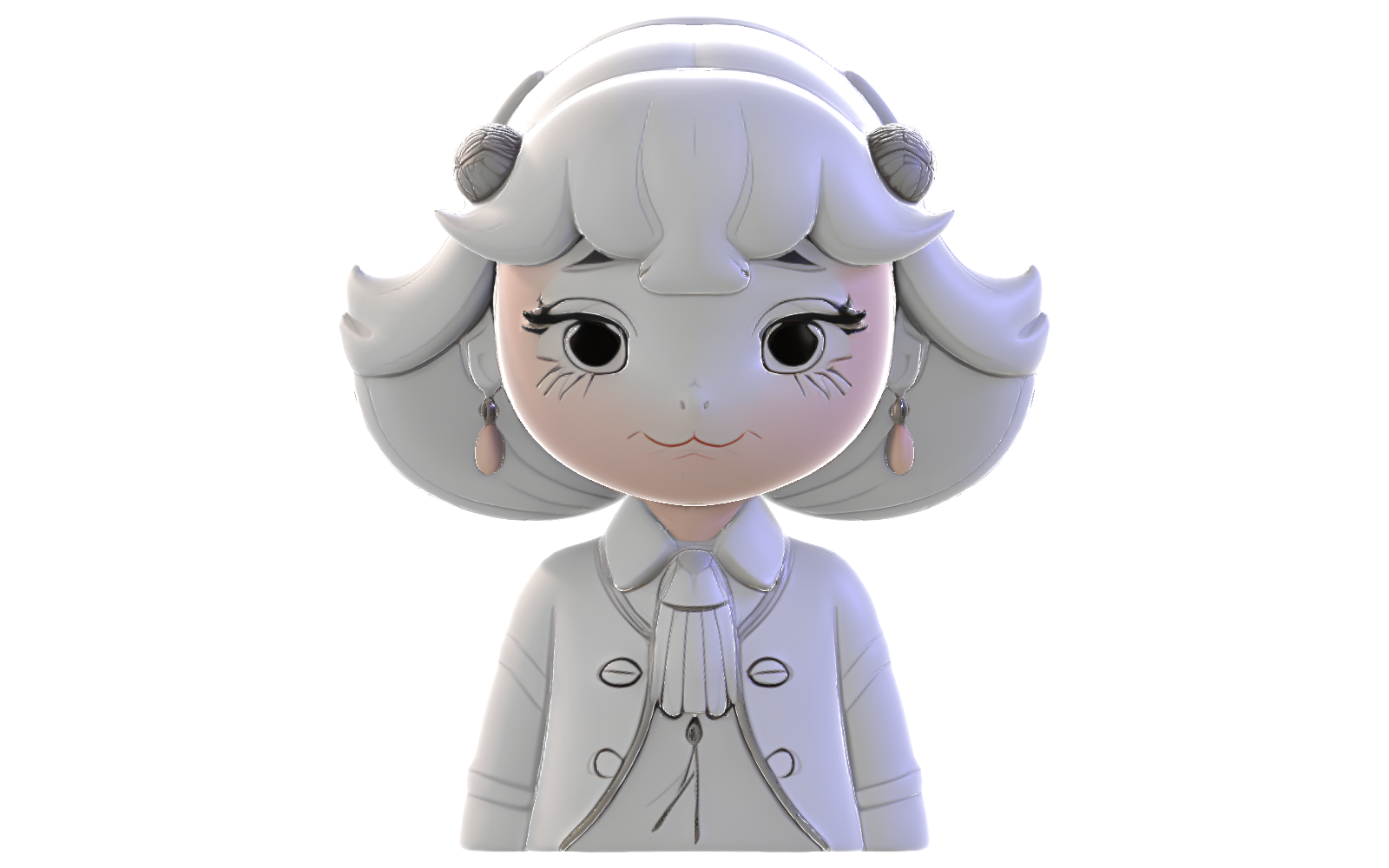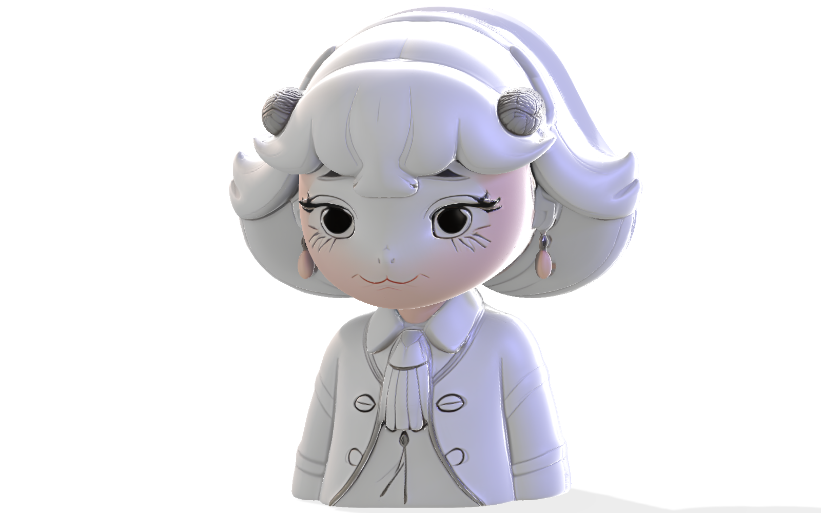 This charming 3D design depicts a stylized character bust of a vintage-inspired lady with a distinct aesthetic. The model features: