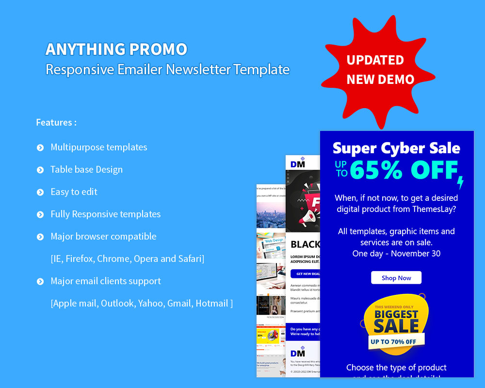 This design template is perfect for promotional or promote products and business services emailer. If you need to build a corporate-styled emailer and newsletter or are looking for a solution that satisfies multiple needs, the Anything Promo - Responsive Emailer Newsletter template will be a perfect choice. The template is great for notifying your regular customers about discounts, simple information and notifications that your company for sale. This template contains different layout structure variations.