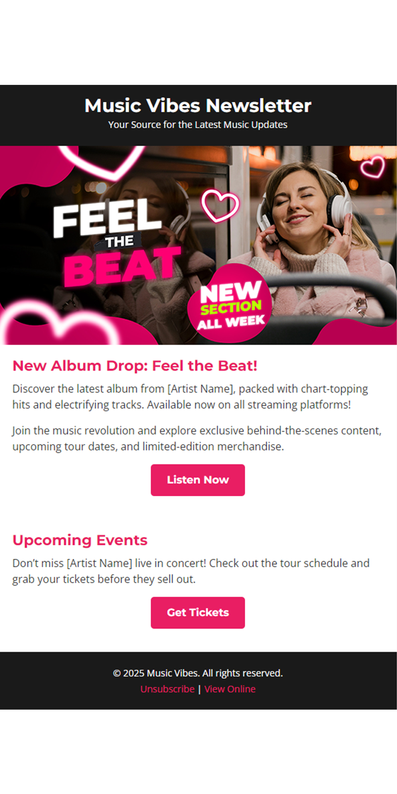 Turn up the volume on your email marketing with MusicPortMail – a sleek, high-energy email newsletter template built specifically for music festivals, concerts, ticket sales, bands, event organizers, DJs, and entertainment brands. Whether you're promoting upcoming shows, selling tickets, announcing lineups, or launching an album, MusicPortMail is your backstage pass to high-converting campaigns.