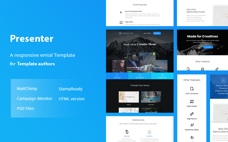 Present your digital products in style with Presenter, a sleek and fully responsive email template perfect for showcasing WordPress themes, plugins, and other online products. Include demo links, highlight key features, list add-ons, and share customer reviews—all in a modern, conversion-focused design. Fully compatible with MailChimp, Campaign Monitor, StampReady, and all major email clients, Presenter ensures your message looks flawless on any device. With drag-and-drop editing, customizable modules, PSD files, and full documentation, creating professional product campaigns is quick and effortless