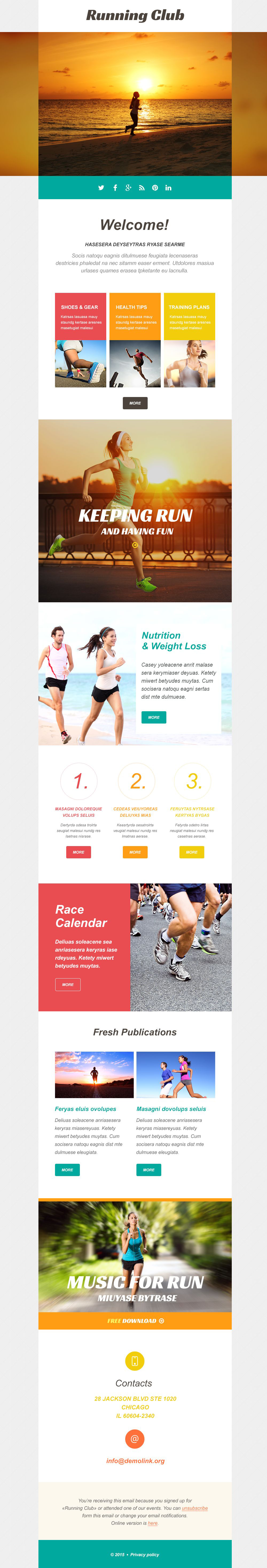 A clean and well-designed template that promotes a healthy lifestyle and a beautiful life! This template starts with your club's logo and continues with a gorgeous high-quality image that represents your activity completely. Following, there is a block that highlights all the social media channels you're using and then the newsletter layout continues with the body. Here, like most email templates, you'll be able to talk to your readers about your updates, new offers, engaging activities, and more.