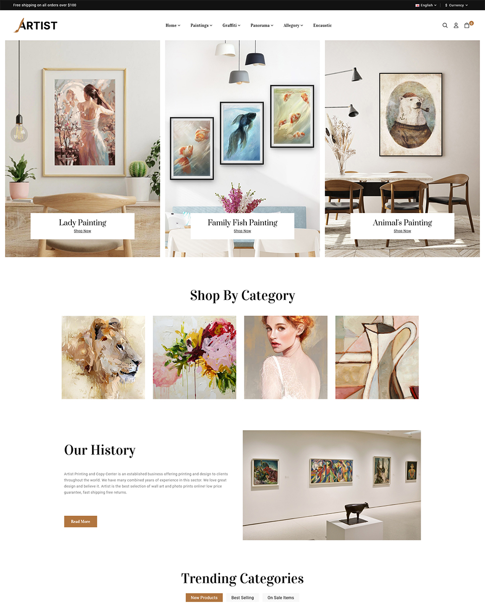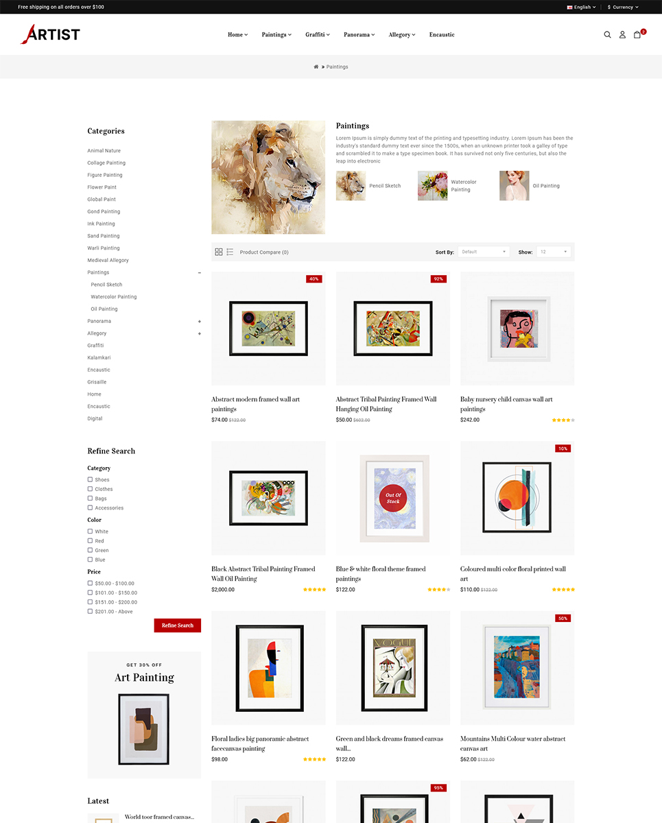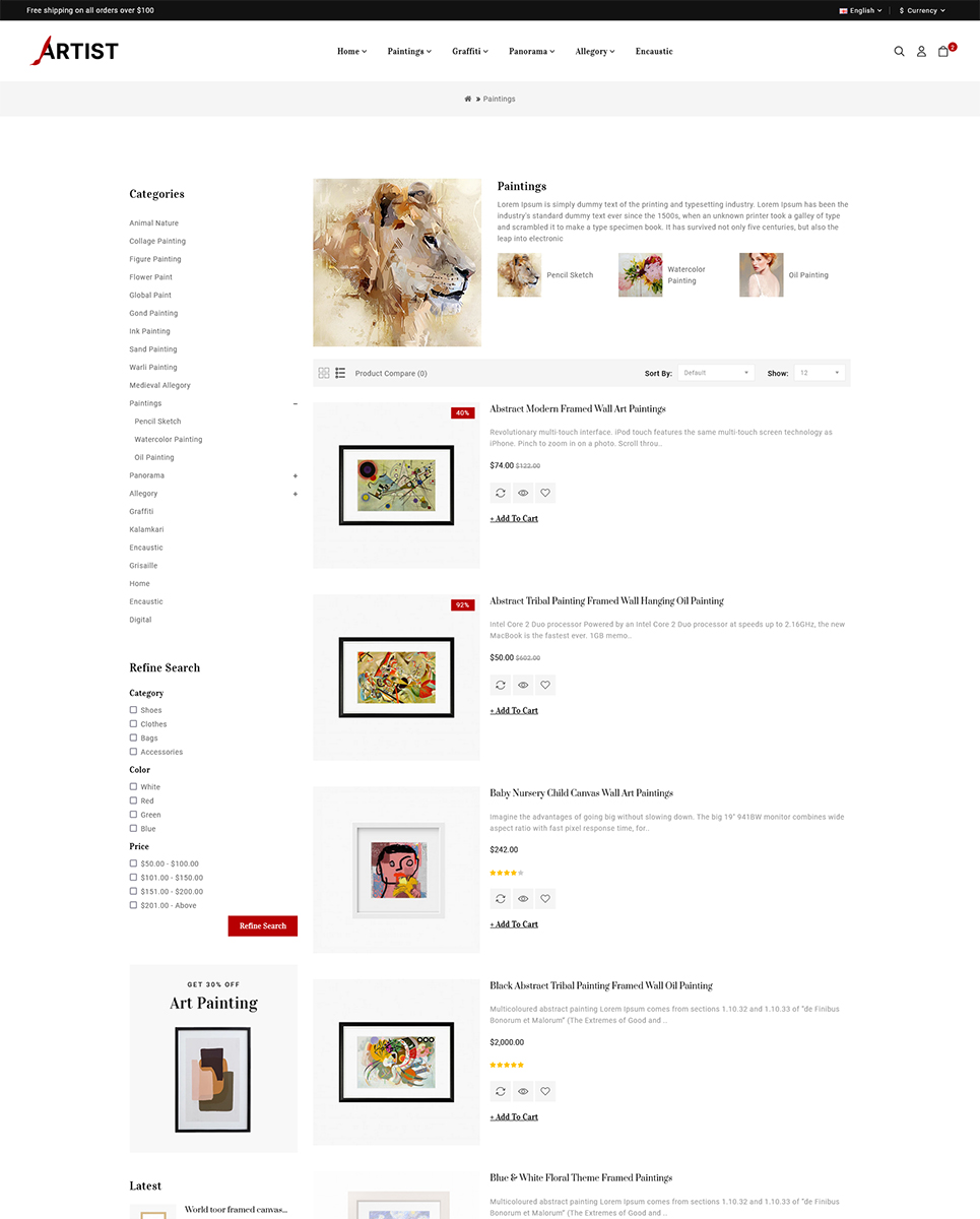 Artist - Art and Gallery Multipurpose Responsive Opencart Theme designed for every art gallery shop, fine art gallery, exhibition, museum, and artist portfolio. The theme has a refined design style and a selection of layouts ideal for every artist, art shop, museum, and art gallery. It comes with 2+ ready-made homepage layouts. It’s mobile-optimized and easy-to-customize. You could start your site today! Create a beautiful exhibition for all your art, and talent with the Artists store. Whether you want to present a collection of work, inspiration, products, or services, this portfolio template has every detail covered. Artist Opencart store is designed for visually stunning websites, with large sliders and images, stylish carousels for art exhibits, and generous footers.