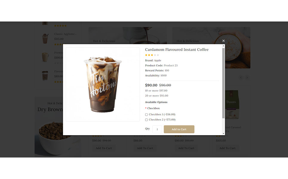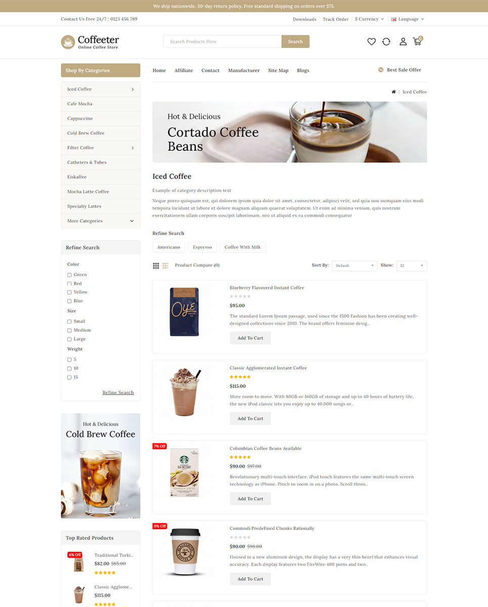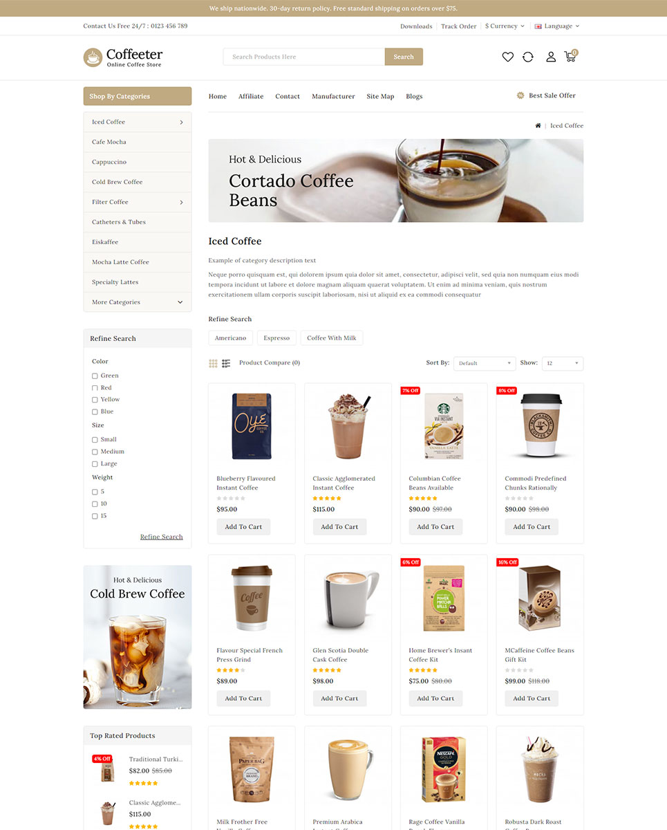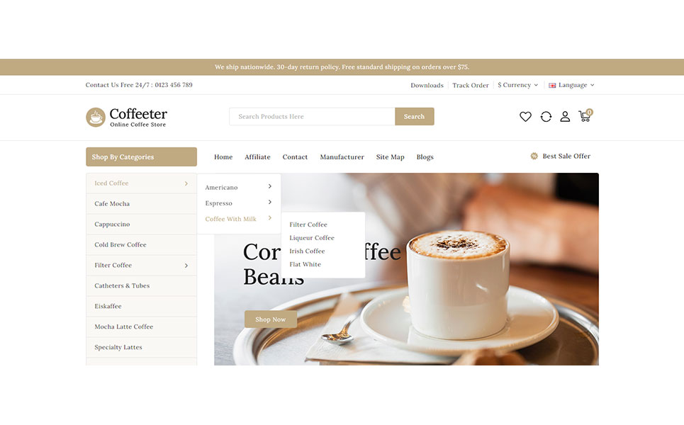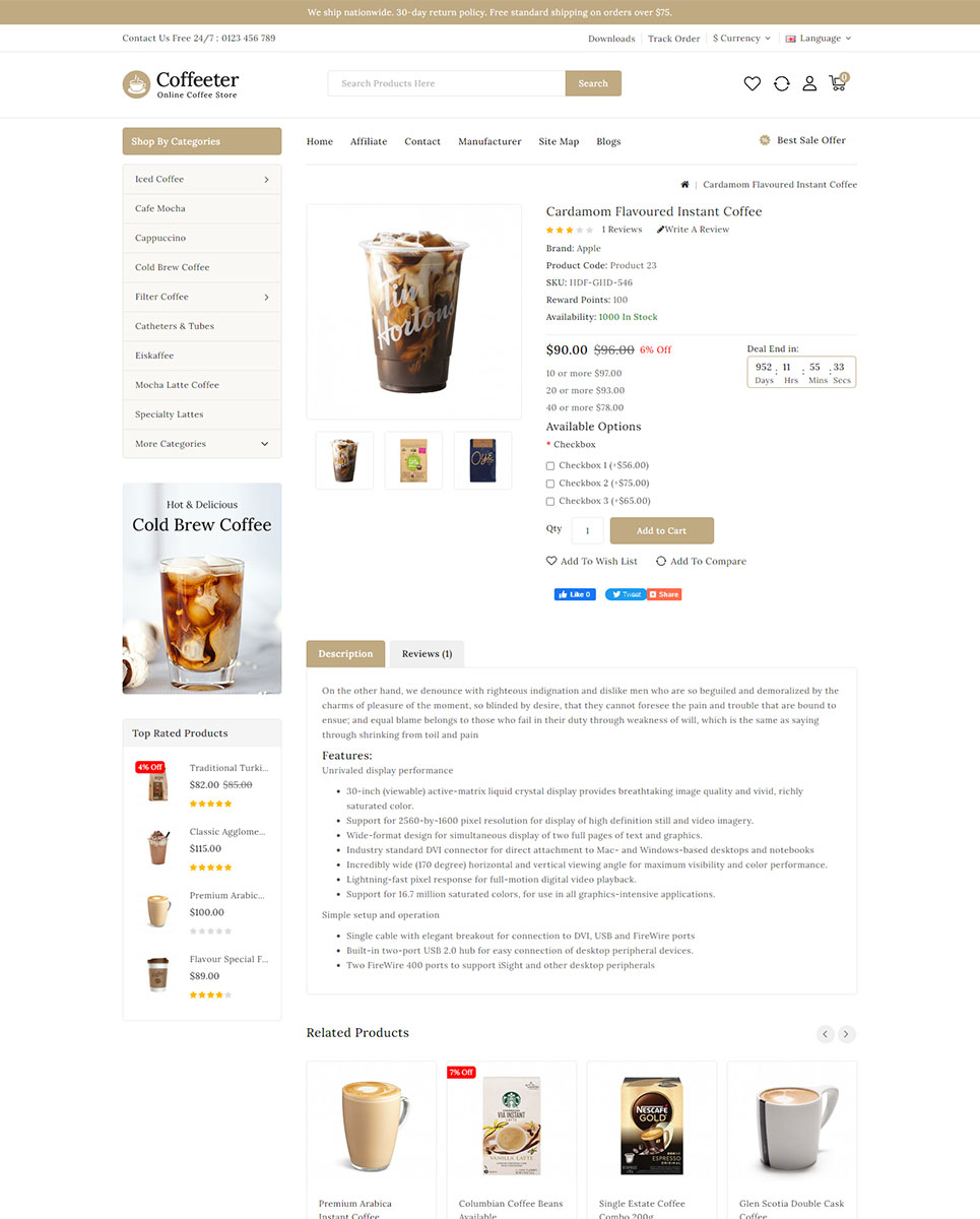 Coffeeter theme has easy to use navigation menu with flyout dropdown which shows category list step by step to navigate customer to their desire category and find relevant product. Deal Of The Day product section shows discounted items with sale count down timer to attract customers for buy that products in few hours. Moreover, Ajax price update feature added on product detail page which change original price with select different available option.