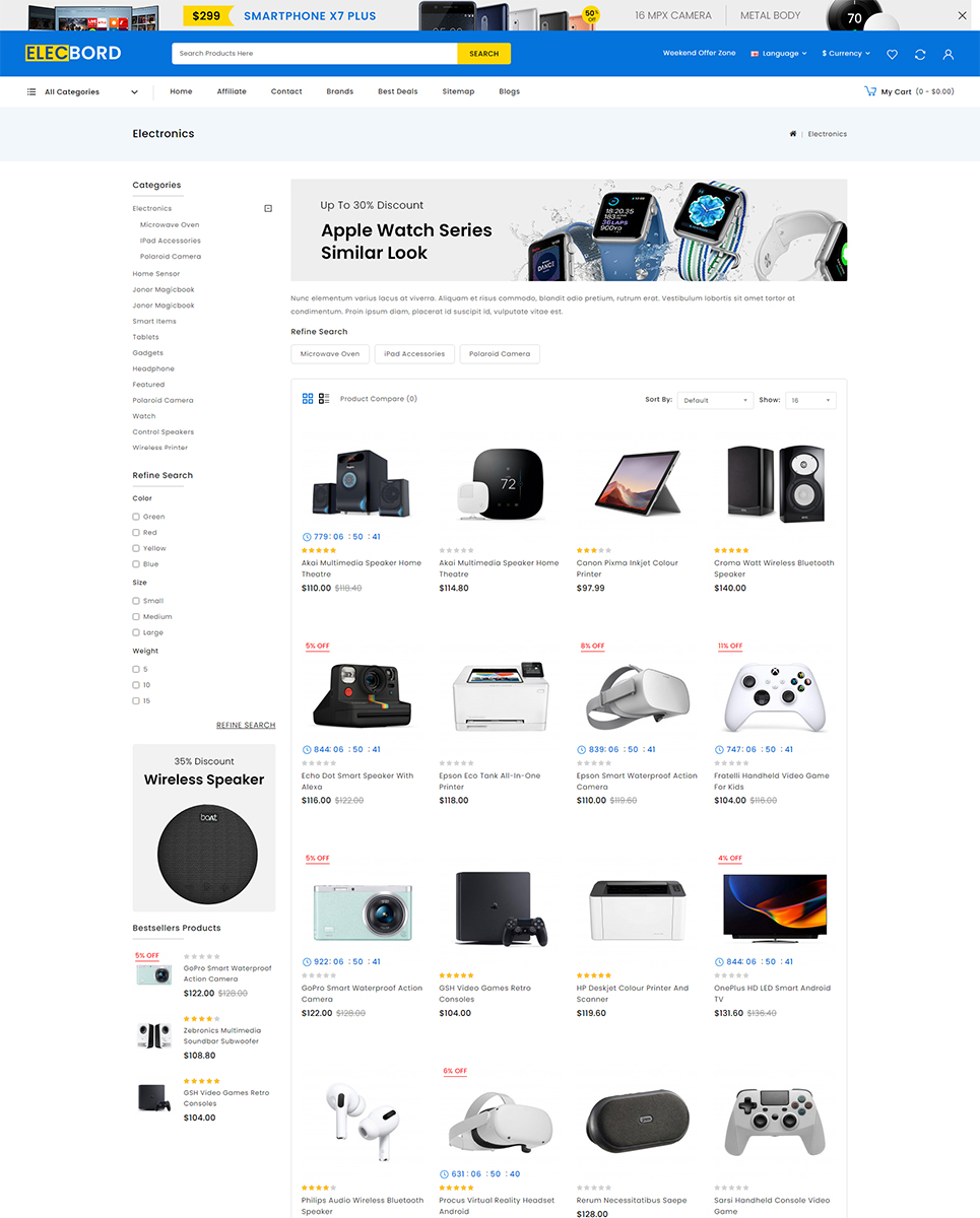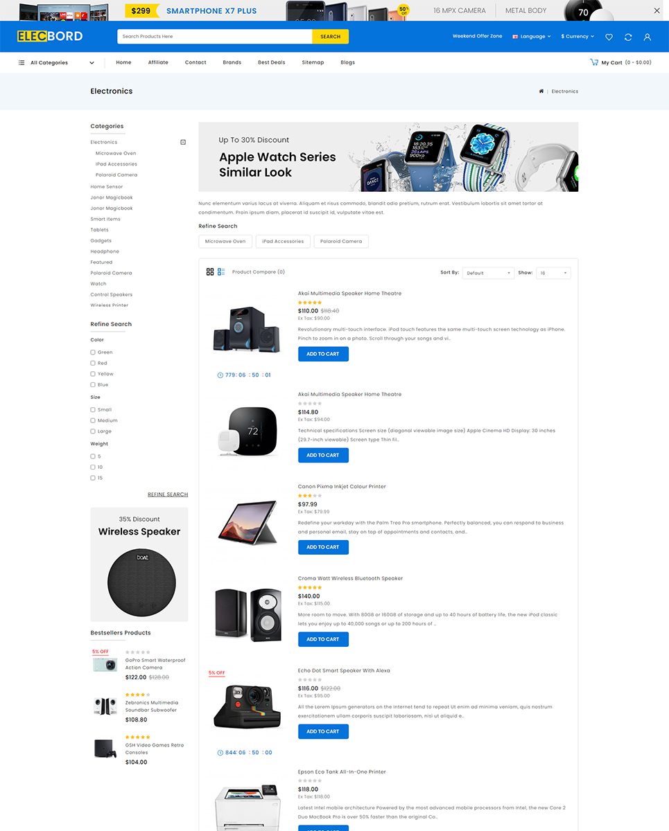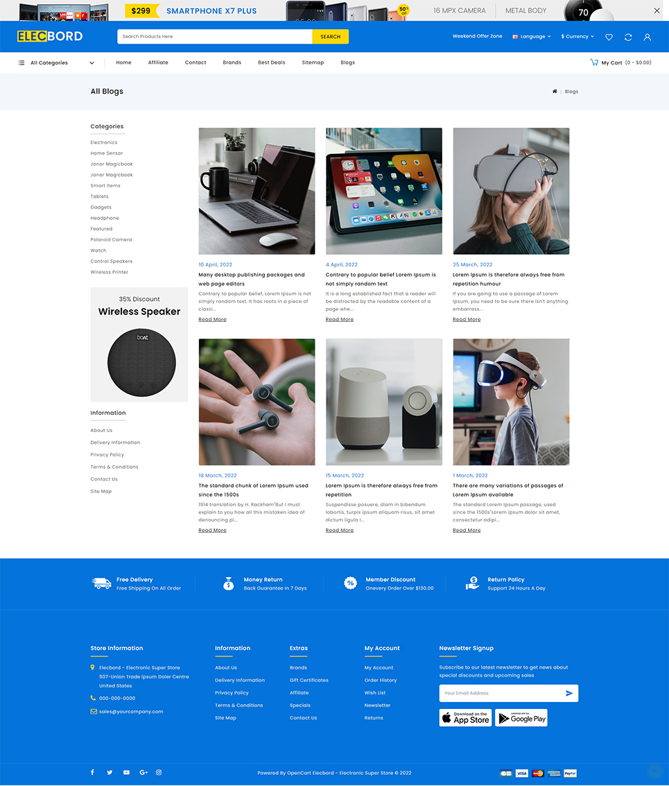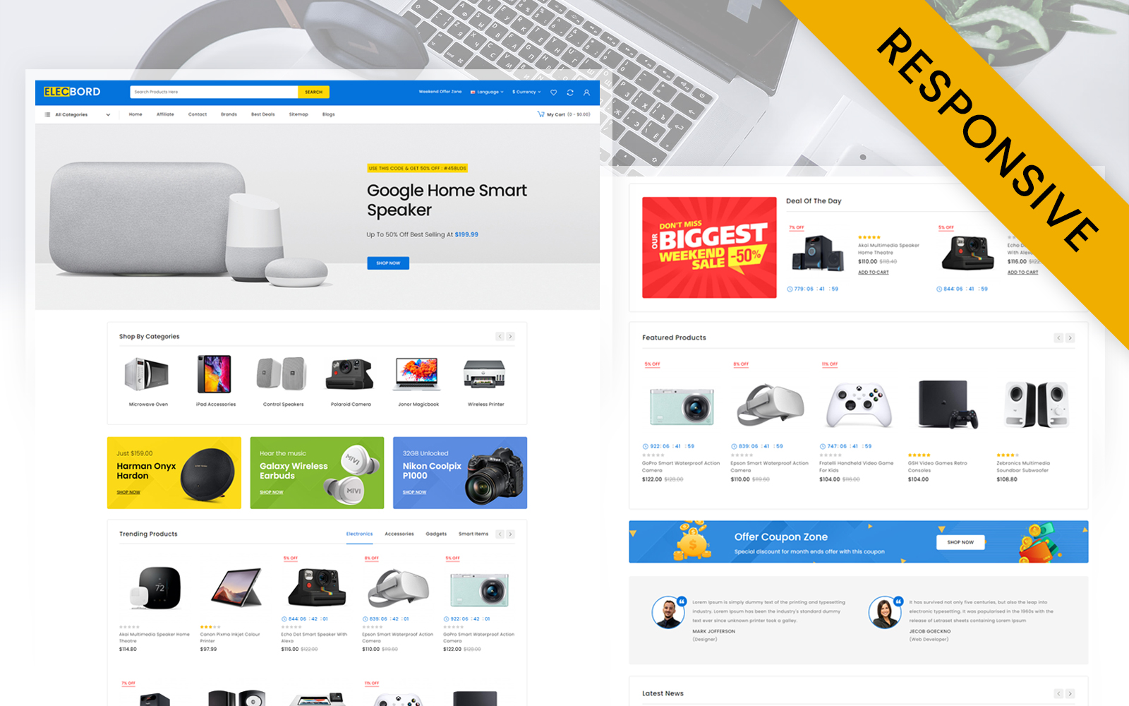 Elecbord Multipurpose Electronic Super Store Opencart 3 Responsive Theme helps you to build your brand in eCommerce Market with it's Modern and Fluent design which actually created by our best designer team after customers suggestion and requirement. Theme design best suits for your products like electronics item, digital products, mobile, computers, laptop, speaker, sound system, CCTV, camera, watch, accessories, home appliances, kitchen accessories, fashion, furniture, home decor items etc..